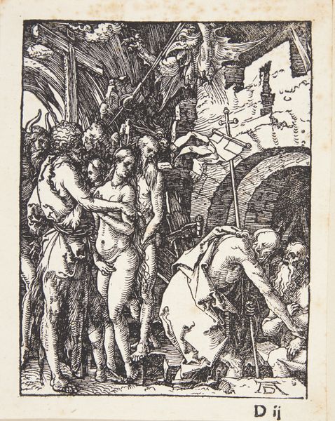 Curator: Look at this fascinating piece; it is called Zondeval, or The Fall of Man, created by Hans Holbein the Younger sometime between 1524 and 1538. It's a woodcut, part of a series exploring stories from the Old Testament, currently held here at the Rijksmuseum. Editor: My immediate impression is one of unease. There’s a frenetic energy to the composition, a real sense of disruption communicated through the stark lines. The whole scene is dense, claustrophobic almost. Curator: Precisely. Holbein uses line to masterful effect, creating depth and texture. Notice how he populates the Garden with creatures – not the serene paradise one might expect, but a forest teeming with anxious-looking animals. The cultural memory here is about so much more than a simple error of judgment; there is the deep sense of disruption of an entire ecological order. Editor: And what about the figures of Adam and Eve? The image certainly diverges from traditional depictions of them. Their nudity feels exposed, vulnerable, a departure from classical idealism. The figures don't exist in isolation, which is to say that it reflects back on the broader visual and political context of Holbein's era. Curator: Indeed. They reflect a very human anguish and psychological reckoning, the consequence of the Fall laid bare on their very beings, echoing the moralizing trends popular during the Northern Renaissance. See how the serpent dominates the scene? It wraps the tree with almost sensual malevolence, becoming the focal point that precipitates action and consequence. Editor: The tree of knowledge then transforms into an almost violent spectacle, disrupting a sense of stability, while Adam and Eve appear to become separated not just from grace but each other as well. How much of this commentary speaks to the broader anxieties of the time, particularly about religious authority and moral decay? Curator: Absolutely, and there's more to unpack in relation to social structure and shifting cultural ideals. Holbein’s woodcut captures a moment laden with not just religious weight but cultural and psychological shifts as well. Editor: The brilliance lies, perhaps, in its capacity to speak volumes on cultural anxieties using such stark, graphic immediacy. A profound exploration, wouldn’t you say?