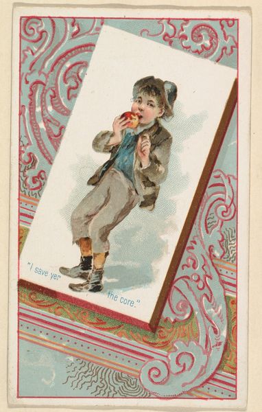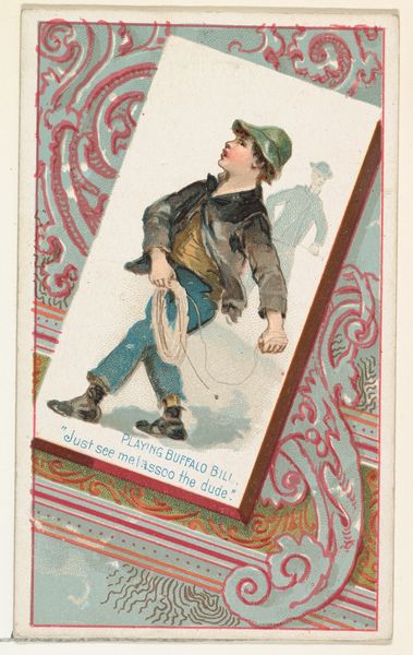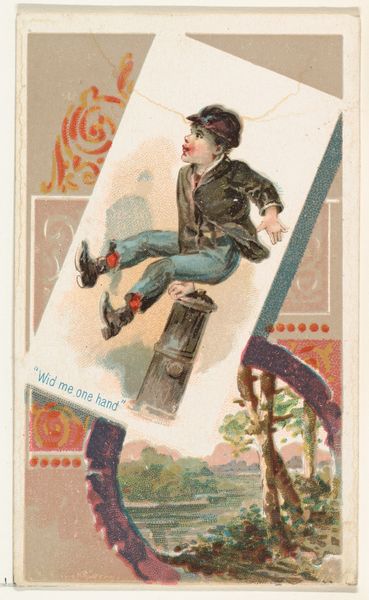 Curator: This curious print, dating from between 1888 and 1889, belongs to a series titled "Terrors of America." It was issued by W. Duke, Sons & Co. to promote their Honest Long Cut Tobacco. The piece before us is called "\"Wid me one hand.\"" Editor: Immediately, the odd composition strikes me. A chimney sweep, or a boy dressed as one, perched rather precariously. The palette, all pastels and faded jewel tones, reinforces this dreamlike impression. Curator: Indeed. The materials employed are modest – it is merely a print, meant for mass consumption tucked into packages of tobacco. However, this very disposability speaks to the broader social context: the burgeoning industrial age, marketing's increasing influence, and the commodification of even childhood itself. Editor: Observe the figure’s posture – he strains, one hand extended for balance. The composition tilts, heightening the sense of precariousness. And there's the visual rhyming of curves and lines: the sweeping curves in the decorative background that lead towards the cylinder of the chimney, echoed by the arch of his legs and back. It lends a certain dynamism to this small rectangular object. Curator: This type of visual commodity speaks volumes about social hierarchies, urban life, and the romanticized, even exoticized, portrayals of labor. The boy, precariously positioned, becomes a symbol, I believe, of the working class itself – their lives often balancing on a razor’s edge. Editor: I would add that there's the fascinating semiotics of costume: the tattered clothing, the patched knees – clear visual markers of the subject's social standing. The artist’s choices regarding line, tone, and perspective emphasize a particular type of fragility in this small print. Curator: What started as disposable ephemera provides so many opportunities to reflect on the means of production and, further, the human cost exacted by progress. Editor: I leave this encounter captivated by the careful construction and odd beauty present in something mass produced and commercially minded, offering unique perspective into social strata.