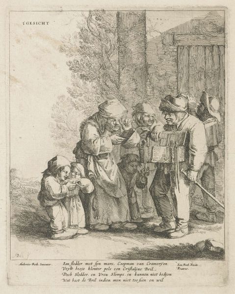 Curator: Here we have Isaac Cruikshank’s "Krantenlezers te Bath," or "Newspaper Readers in Bath," created in 1796. What's your initial take? Editor: There's a tense energy here, isn't there? Everyone is so close, packed together, with such strong expressions on their faces. You can almost hear the heated debate about what’s written on those papers. And the weight of the issues feels...palpable. Curator: Yes, the composition really underscores that feeling. Look at how Cruikshank employs line. Notice the etched lines that create these defined figures? It's all angular gestures, capturing fleeting moments of shared experience with a caricatured flare typical of the era's Romanticism. Editor: Absolutely, but beyond the aesthetic, consider the actual labor involved here. The etching, the inking, the printing... These newspapers weren't easily accessible items. They represented knowledge, power, and social status, all literally pressed onto paper. Curator: A keen observation. There's also the semiotics at play. Newspapers symbolize more than just the printed word; they represent Enlightenment ideals, civic discourse. But here, distorted features and intense interactions satirize it. It questions that order. Editor: I agree that we are clearly seeing satire here. However, I read it through the lens of the social dynamics: who has access to information, how it's disseminated, and the very human responses it provokes. Those details bring a specific type of focus on art that I think adds an important new perspective to its qualities. Curator: Indeed. It is that friction that generates such vibrant narratives. Understanding these formal structures helps contextualize broader artistic movements. Editor: Well, recognizing that materiality and labor offer a deeper appreciation of this piece’s position and production. It highlights how closely artistic creation intertwines within its social landscape. Curator: A compelling dialectic indeed.