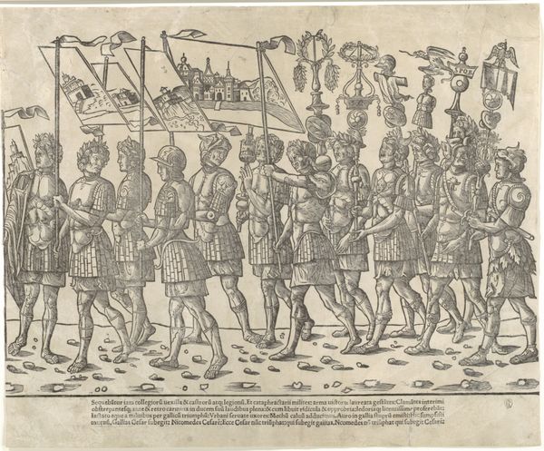 Franciscus Antonius Beersmans created this piece, titled "Belgisch leger / Armée Belge", using an engraving technique. This triptych visualizes the transformation of the Belgian army. On the left, we see soldiers in antiquated armor, reminiscent of a medieval or early Renaissance army. The central panel transitions to soldiers with more modern uniforms, though still quite ceremonial. By the final panel on the right, they are nude, standing before the grim reaper. The image reflects the social and cultural anxieties of the late 19th century, when many feared the impact of modernization on traditional values and institutions. Belgium, a relatively new nation at the time, was grappling with its identity, caught between its historical roots and its aspirations for modernity. The artist invites us to contemplate the transient nature of military power and the inevitability of change. To truly understand this work, one might delve into military history, the social history of 19th-century Belgium, and the artistic conventions of the period. Art history is not just about aesthetics; it's about understanding the complex interplay between art, society, and history.