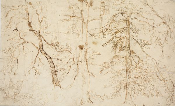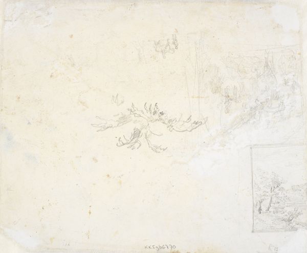 Curator: Dankvart Dreyer's "Træstudier," created sometime between 1831 and 1852, presents a study in realism through landscape, using the delicate mediums of pencil and etching. Editor: My first thought? It feels unfinished, like a dream barely remembered upon waking. Wisps of trees outlined in ghostly ink...it’s almost haunting in its ephemerality. Curator: Indeed, the lack of complete finish invites an interpretation focused on the structural underpinnings of the composition. Notice how Dreyer uses the contrasting weights of line to create depth and spatial recession. The foreground trees, though sketched with swift, almost scribbled marks, still assert their presence through darker lines and thicker trunks. Editor: Those “scribbled marks” you describe…I see them as more than just quick notations. There's a deliberate, rhythmic quality to the marks mimicking the movement of leaves in a gentle breeze, don’t you think? Like he’s trying to capture the fleeting essence of a moment. Curator: Such interpretations, while imaginative, risk projecting onto the artwork. It is more rigorous to appreciate how the density of linework functions. Dreyer strategically varies line density to indicate shadow and volume, effectively structuring the image. Editor: But isn’t art supposed to move us? For me, this isn’t just an academic exercise in line density. It’s about the whisper of the wind through the trees, the artist’s hand trembling to capture the raw, fleeting beauty. Look closely—can't you almost hear the leaves rustling? Curator: While emotional responses are valid, let us ground ourselves in visual analysis. Consider how Dreyer’s technical skills highlight an underlying compositional balance—the darker tree on the left countered by a lighter cluster on the right creating a carefully calibrated sense of equilibrium. Editor: A meticulously balanced fleeting moment, captured with shivering excitement… it is a delightful paradox. Even a study like this shows Dreyer's unique creative vision. Curator: Precisely, it underscores how structure and artistic insight combine to define visual art’s complexity.