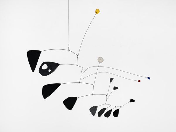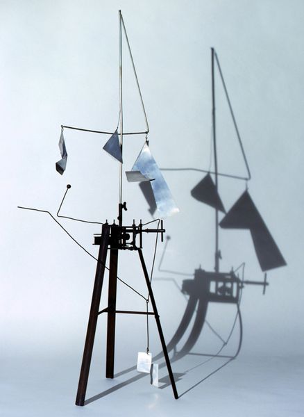 Curator: Let’s spend some time with Alexander Calder’s kinetic sculpture, "TINES," created in 1943. Calder masterfully uses metal to bring to life a constellation of shapes suspended in space. Editor: It strikes me immediately as incredibly light and airy, almost a drawing in space. The way the elements are balanced—it has a beautiful formal tension. Curator: Calder's work emerges from a period profoundly shaped by the anxieties of World War II, and his mobiles offered a deliberate counterpoint, an assertion of lightness against the backdrop of global conflict. Editor: You can really see that through the careful construction. Look at how he uses the metal—it's minimal, yet so deliberate. Each line contributes to the overall visual experience. It reminds me of Miró's paintings, that sort of whimsical play with forms, but realized in three dimensions. Curator: Indeed. Calder also engaged deeply with the political climate through his art. The precarious balance in this work subtly evokes the fragility of peace during this era, almost like an argument for non-violence as the delicate suspension of the elements suggests inherent tensions, yet nothing collapses. Editor: That’s a really interesting point. But what I love is how it functions purely as form and movement. Even without the historical context, one could spend hours contemplating the interplay of shapes and how the piece transforms with every gentle shift in the air. The materiality too, right, with how metal—a traditionally static material—achieves weightlessness and ethereal qualities here. Curator: Yes, I believe it shows Calder’s ingenious way of synthesizing personal artistic exploration with wider societal concerns, making this far more than a study in pure aesthetics. It's about our world and the hope for dynamic equilibrium. Editor: And seeing the art engaging the viewer on all fronts—the movement and materiality giving so much for the eyes to take in. It truly underscores the complexities that exist, even in something as seemingly simple as a balanced mobile. Curator: It’s these multiple levels of meaning and experiences that keep drawing us back to his work. Editor: Absolutely. Calder teaches us to look closer at not just art but to life as a series of interconnected motions and weights.