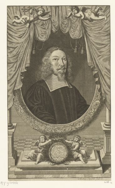 Editor: Here we have a print titled “Portret van een onbekende man, mogelijk Senis,” or “Portrait of an unknown man, possibly Senis,” created between 1670 and 1680 by Isaak Saal. The medium is engraving on metal. It has such a distinguished, almost solemn air. What do you see in this piece? Curator: Immediately, I’m drawn to the iconography embedded within this portrait. Consider the subject's hand gesture – it's not just a pose. It resonates with gestures found in religious art, suggesting contemplation, perhaps wisdom. Notice his garb, its darkness broken by the white collar. Think about the significance of these colours. Editor: Yes, the contrast really does draw the eye. Curator: Precisely. In this period, the somber clothing against stark white frequently indicated membership within intellectual or governing elites. These weren’t merely fashion choices but visual signifiers to communicate respectability, wisdom and knowledge. But does that clarify who exactly is this “Senis"? And is he *really* unknown? Editor: Possibly a respected scholar or politician? Curator: Exactly! Further emphasizing his presence is the Latin text displayed, effectively preserving, praising, and immortalising a patron of intellect for posterity, cementing the figure's perceived value to his peers and descendents, preserving not just likeness, but also character, memory, and ethos. What does the image and text memorialize? Editor: So it's not *just* a portrait... it’s actively constructing and preserving his image, memory, *identity*. Curator: Indeed! It's a potent reminder of how we construct legacies through visual language.