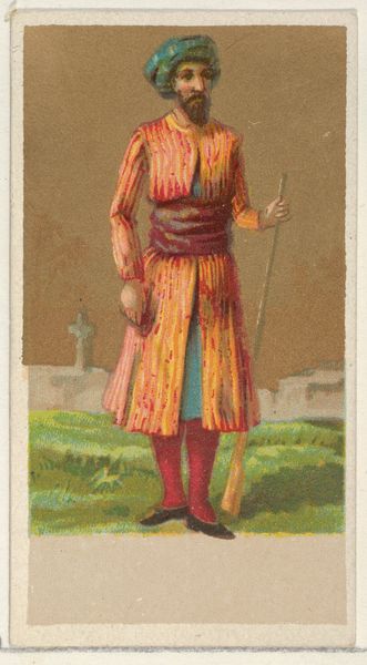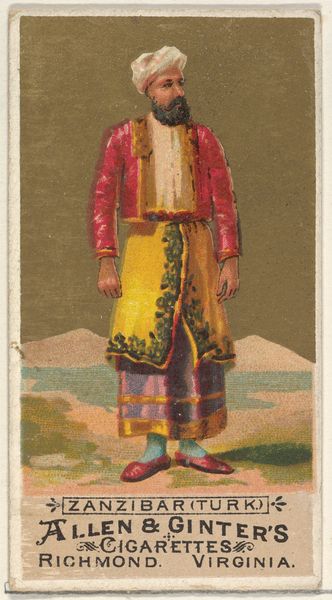 This small chromolithograph was created by Allen & Ginter, a cigarette company, as part of a series called "Natives in Costume." These cards, distributed with cigarette packs, reflected the late 19th-century fascination with exotic cultures, filtered through a lens of imperial power. The image presents a figure labeled "Hindustan," a historical name for India, dressed in what is meant to be traditional attire. The man's clothing, his posture, and even the weapon he carries, all construct a narrative aimed at a Western audience. Consider how this image would have been consumed: as a collectible, a momentary distraction packaged with a product. It perpetuated stereotypes and simplified complex cultural identities for commercial purposes. This card isn't just an image; it's a small but potent example of how cultural understanding can be shaped, and often distorted, by commerce and colonial attitudes. Think about the power dynamics at play and the gaze through which such images were created and consumed.