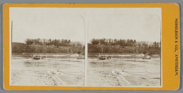 Curator: Let's turn our attention to "Three Men on Sheldon Point Overlooking Lake George, Seen from Trout Pavilion," a gelatin-silver print created by Seneca Ray Stoddard between 1870 and 1890. Editor: There's a stillness to this piece. A quiet, contemplative mood washes over me just from the balanced composition, the symmetry created by the reflection in the water. Curator: I find it fascinating to consider Stoddard's process. Producing photographs at this time meant wrestling with the chemical baths, mastering exposure times and the portable darkroom required in landscape photography. Think of the physical labor behind creating a seemingly effortless scene. Editor: True, and the tonal range is limited yet masterfully utilized. Notice how Stoddard employs subtle variations in greyscale to create depth. The figures, positioned at the edge, lead your eye into the expanse of the water and toward the distant shore. Curator: I’m more interested in what it meant to picture leisure during the gilded age. Lake George became this manufactured escape, but the reality involved railroad access, boat transport, even the very pavilion the scene is photographed from—all industries reshaping the landscape, turning nature into commodity. Editor: I understand, yet the appeal remains in the delicate play of light and shadow, the hazy atmosphere—all contributing to a tranquil, almost dreamlike effect. There's an intentional simplification. The forms are reduced, almost abstract. Curator: Perhaps. But who are these figures? Likely tourists or members of the burgeoning middle class seeking respite. This image reflects a manufactured idyll. And gelatin-silver prints were easily reproduced, so mass dissemination contributed to this romantic idea of landscape and leisure. Editor: Still, regardless of social motivations, the photograph is a testament to compositional and tonal subtleties that transcend mere documentation. I am moved by its delicate visual structure. Curator: So, through examining both form and the conditions of its creation, we can understand the complexities of photographic meaning. Editor: A stimulating dichotomy between the aesthetic and the historical.