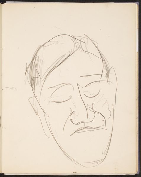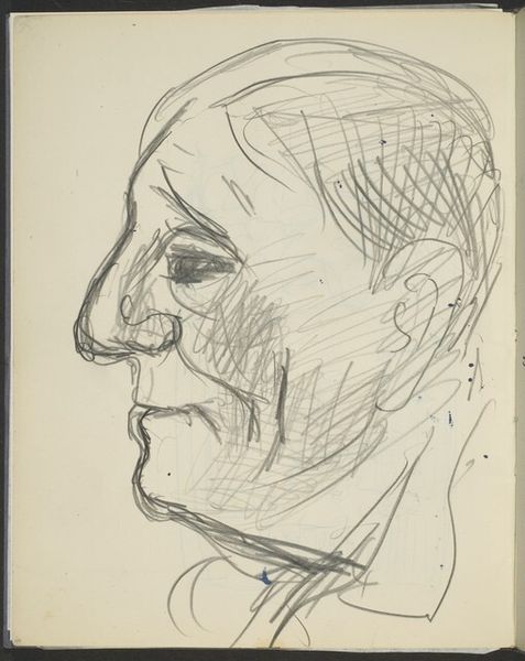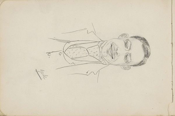 Editor: This is "Mann im Frack" or "Man in Dress Coat," a pencil drawing by Max Beckmann. It looks like a quick sketch. What strikes me is how unfinished it feels, yet it still conveys a sense of character. What do you see in this piece? Curator: Indeed. Note the artist's precise use of line. Observe how line is not employed to render detail but rather to construct the essential volumes and contours of the figure. Consider how Beckmann manages to establish a representational figure by deploying line. Editor: I notice that the lines seem kind of scribbled around the bow tie. Why are some areas so much less defined than others? Curator: One might argue that the varying density and direction of the lines serve a structural purpose. Is it possible that the rapid, seemingly chaotic marks in areas such as the bow tie actually establish a textural contrast? This is contrasted with the more refined articulation of the face and collar? In the composition, this dichotomy invites contemplation on the artist's strategic approach to rendering form. Editor: That's interesting! I hadn’t thought about the contrast intentionally creating a visual push and pull. So, the way the lines are used isn't arbitrary; it's fundamental to how we perceive the image. Curator: Precisely. Formal analysis pushes us to closely observe the compositional and constructional principles and to appreciate the artist's calculated execution. Editor: That's given me a fresh viewpoint of what constitutes “finish” in art. It appears I still have a lot to learn about visual construction.
