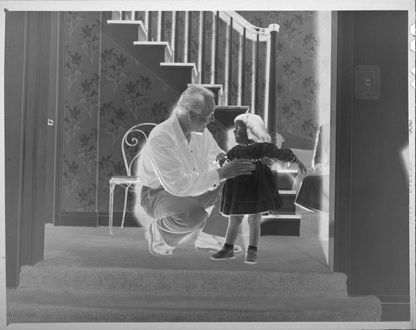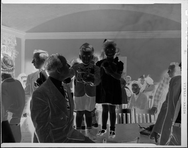 Curator: This gelatin silver print, presently held at the Harvard Art Museums, is titled "Untitled (boy and girl in living room)" and is attributed to Lucian and Mary Brown. Editor: There's something undeniably eerie about the inverted tones here, it almost gives the impression of ghosts in a domestic setting. Curator: Indeed. The negative image throws conventions of representation into sharp relief. Children in a home—such a ubiquitous subject—but here, made strange. Editor: The placement of the staircase in the background is striking. Stairs often represent transitions, change... Perhaps the children are on the cusp of something? Curator: Or, read more plainly, the architectural details suggest the social status of the family. The home itself performs a role here, signaling respectability and aspirations. Editor: That's a great point. Either way, it feels far from straightforward. Curator: Photography, like history, is never truly objective. This piece reminds us how choices of representation reflect broader cultural narratives. Editor: The reversed tones certainly add a layer, provoking deeper reflection.