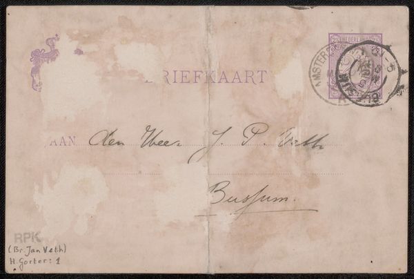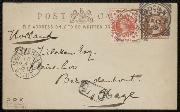 Curator: At first glance, it seems quite a subtle piece—almost whispering. This anonymous artwork, created between 1859 and 1869, goes by the name "Valentine." It’s currently held at the Metropolitan Museum of Art, in New York. You can see that it’s primarily rendered in ink, likely a print transferred to paper, and embellished with lovely calligraphy. Editor: Whispering is exactly right. The monochrome palette, faded details, even the fragility of the paper... It's like a forgotten sentiment. Makes you wonder about the story behind it, doesn't it? All that work gone into sending it… Who was Ernie Sutton? Curator: Exactly! And consider the embossed floral motifs— framing the envelope. Embossed paper goods signified special occasions, the way printed holiday cards or wedding invitations carry weight today. Editor: Absolutely, like a heraldic crest but flowery! Also notice how this floral frame guides our eyes right to that gorgeous Spencerian script addressed to Miss Ernie Sutton in White Plains, NY. That style of penmanship speaks of an era when writing was truly an art, a practiced skill of expression, carrying the weight of sentiment more than it does now. It makes you wish for letter writing to be revived in a way, no? Curator: Indeed! Also see the circular postmark. “Fishkill,” the town name practically shouts old-world charm. And that stamp... a solemn-looking George Washington presiding over a two-cent value. This entire envelope is laden with symbolism: not just about love, but of an era, values, and visual elegance. The value seems also to be found in the visual message the sender wanted to communicate to young Miss Sutton. It’s like a small portrait, and yet an open book at the same time. Editor: Almost haunting in its delicacy. Imagine the anticipation of receiving this ornate message! It transcends just a declaration of affection. I like to imagine her delight. A keepsake preserved through generations of sentiment. We are lucky enough to keep experiencing its significance, just as its original sender intended for its addressee.