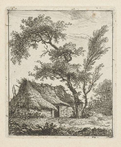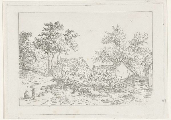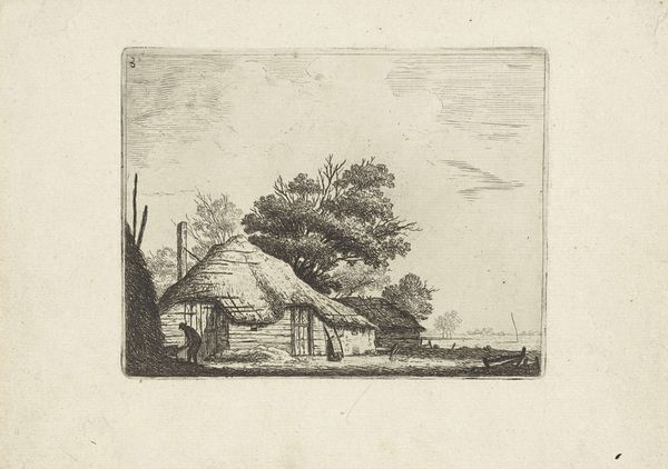 Curator: Here we have "Farm with Four Sheep," an engraving created sometime between 1781 and 1822 by Hermanus Fock. Editor: It feels so calm. A little worn-down, but there's a sense of quiet rurality that almost romanticizes labor, or perhaps hides it. Curator: Landscape art, especially within Dutch visual traditions, certainly carried those connotations. Fock lived and worked in Amsterdam, during a time of significant socio-economic change in the Netherlands. The imagery, with the unassuming homestead, speaks to a vision of simpler life. Editor: And notice how the composition almost feels staged. The way the sheep are positioned in the foreground, almost posing, redirects the eye to the house with an open door and figure in the threshold. Curator: A common artistic technique from the Baroque period to guide the viewer's eye. Consider this through the lens of emerging capitalist systems. How were images of the countryside being deployed to create specific narratives about national identity and the agricultural class? Were idyllic scenes like these a type of escapism? Editor: I’m wondering, who is allowed in and who is kept out? That partially broken fence makes me question who’s meant to access this land. Is it a community space, or is this an argument for ownership? Are we meant to see the home or are we encouraged to only enjoy the livestock? Curator: Excellent point. We should remember that landscape art wasn’t just about picturesque scenery. It was intricately tied to evolving power structures and economic models. Editor: A perspective that keeps me questioning whose gaze we're adopting and how the land, labor, and belonging are being represented. Thank you for providing more historical context around the art. Curator: And thank you for your insight; you’ve given me a richer appreciation for the social complexities embedded within seemingly peaceful scenes.
