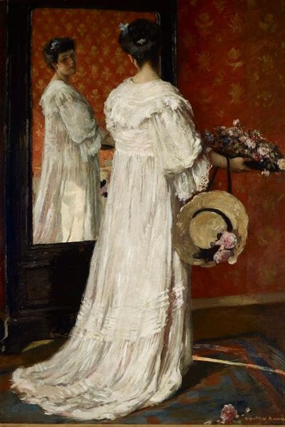 Editor: Eastman Johnson's "Woman in a White Dress," painted in 1873, depicts a woman turned away from us, standing near what appears to be a doorway. The brushstrokes really highlight the materiality of the dress, giving it this flowing, almost ethereal quality. How do you interpret this work, especially thinking about its construction and materials? Curator: What strikes me is the sheer volume of fabric used for this dress. Consider the economic implications. The materials—the cotton, the dye, the labor involved in its creation—all speak to a certain social class and status. Was it factory-made, or bespoke? The question really drills down into the changing modes of production at the time, and the rise of consumerism among the upper classes. Editor: So, you're saying the dress itself is as much the subject as the woman wearing it? Curator: Precisely! The white dress wasn't just aesthetically pleasing; it signified wealth and leisure. White was difficult to maintain, demanding servants and careful cleaning processes. It highlights a stark contrast—between those who could afford such garments, and the invisible workforce who sustained that lifestyle. Even the oil paint itself, and the availability of that pigment, plays into that system. What was Johnson thinking about consumption when making this piece? Editor: It makes you wonder about the artist's intentions, doesn’t it? Was Johnson critiquing this social disparity, or simply portraying it? Maybe the material choices he made help us understand his position? Curator: Exactly. Looking at the impasto, we can also tell something about the labor involved in creating it. It makes you consider his relationship to his studio assistants and what their conditions were at the time of production. That attention to process opens so many questions! Editor: I hadn't considered it in those terms before. Now I see so many more layers to the image—beyond just the surface beauty. It's not just a woman in a dress, but a statement on the socio-economic context of the time. Curator: Indeed! Considering these elements reframes how we look at the whole history of art, really.