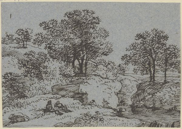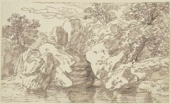 Editor: Here we have "Mountain Landscape with Grazing Sheep, with a Castle in the Background" by Franz Kobell. It appears to be crafted with ink, pen, and pencil. It gives me a sense of depth; the way the landscape unfolds, with layers of rocks and trees, leads my eye towards the castle in the distance. What do you see in this piece? Curator: Precisely. Focusing on the formal elements, we observe a deliberate compositional structure. Note the artist's use of line. See how the lines vary in thickness and density to create texture and define form. The stark contrast emphasizes the interplay between light and shadow. Consider the diagonal lines pulling our vision into the space and notice that those strong directional cues contribute to its perspective. Editor: That's a good point, I didn't consciously notice the diagonal lines, I felt like they invited my gaze to the background castle but the depth has also something to do with contrast and shades, doesn’t it? Curator: Indeed. Kobell also skillfully employs chiaroscuro, the manipulation of light and shadow. What do you observe about it? How does he create that aerial perspective with those compositional techniques? Editor: Now that you mention it, I notice how the darker foreground elements are sharply defined, while the distant mountains and castle fade into a lighter, hazier tone. It almost feels like there are different perspectives coexisting within a same drawing. Curator: Excellent. This contributes significantly to the illusion of depth. The way the formal elements relate shapes, lines and perspective suggests this careful observation is meant to provide us a new approach to the natural world and our position in it. Editor: I hadn’t thought about it that way! I was simply enjoying the picturesque view, but I see now how much the technique contributes to the piece overall. Curator: Visual experience arises not just from seeing but understanding what we are seeing, the 'how' more than the 'what'.