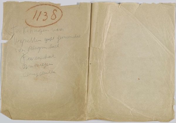 Curator: What a humble artifact—a small, torn piece of paper dating from 1945. This work, titled "Reisdocument," employs mixed media, including drawing and typography on paper. Look at how fragile it appears. Editor: It feels charged, doesn't it? The physical damage speaks of urgency, almost as if it were ripped from someone's hands, or clutched for dear life. I’m drawn to the weight such a small object could carry, particularly at the close of WWII. Curator: Absolutely. And that’s precisely the power it holds. "Reisdocument," which translates to "Travel Document," hints at a life in transit. Its white palette renders the obscured text almost ghostly. A fragmented narrative, really, composed through text and subtle mark-making. Editor: We can only see a snippet of the message: "...after verschiet, Gem. / akabte lung 598 (v) weitergeleitet..." Even partially translated, it tells a chilling story, pointing to forced movement, bureaucracy, perhaps even deportation under the guise of official procedure. A story so common, rendered so specific. It exposes how language itself becomes a tool of displacement. Curator: I’m also struck by the anonymous signature, or lack thereof. It's the artistic equivalent of a whisper—acknowledging presence, yet withholding identity. And perhaps in its incompleteness, it echoes every journey ever interrupted, making a profound statement about anonymity amid catastrophe. I am reminded of the way Adorno conceived of art after the Holocaust: "the unnameable." Editor: And by remaining anonymous, it simultaneously universalizes that experience. It transcends an individual's suffering by embodying the plight of so many displaced individuals, stateless and hunted by a depraved bureaucratic apparatus. The ripped edges and staining speak volumes here. Every crease suggests a folded hope. It urges us to look beyond the objective reality of the artwork itself and feel empathy, kinship... resistance. Curator: It definitely whispers questions about survival, documentation, and what we choose to leave behind when we're stripped of everything. The very act of viewing this fragile document makes us witnesses. Editor: I completely agree. And by grappling with what we do—and pointedly, what we do not—know about its creation, we gain an eerie sense of both hope and despair.