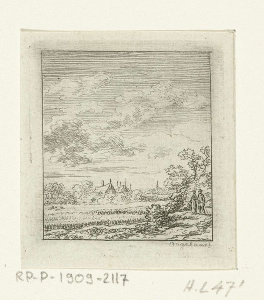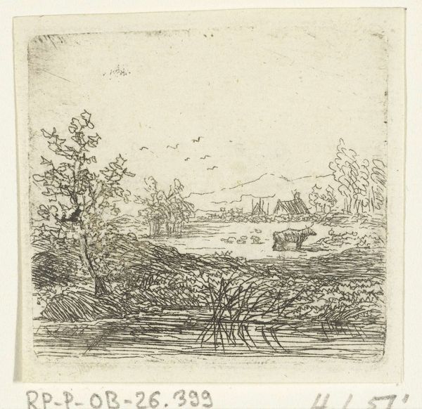 Curator: What a find! This little etching, "Waterlandschap met koe," or "Waterscape with Cow," is attributed to Ernst Willem Jan Bagelaar, dating back to between 1798 and 1837. Isn't it captivating? Editor: It is! Immediately, I'm drawn to the light. It's as though the artist bottled a particularly misty morning. Everything feels a little…transient. Curator: That transience, I think, comes from Bagelaar's masterful use of line. Look how he suggests detail, creating depth and atmosphere. This wasn't meant to be a photorealistic representation, more a fleeting impression of a Dutch landscape. We’re talking romanticism leaning towards realism, capturing an idealized version of nature and rural life. Editor: Yes, exactly! The lone cow standing in the water is almost dreamlike. But that romanticism has edges—that sparse tree on the left has such personality. It makes the whole scene feel incredibly present. What's also curious to me is that, through its details, we are looking at more than simply rural, idealized landscapes. How can we reconcile this fact? Curator: Ah, a very good point! We shouldn't forget that landscape art was increasingly becoming tied to ideas of nationhood and belonging. There's a quiet celebration of Dutch identity in the simplicity of the scene. This sort of thing helped reinforce what it meant to be Dutch during a period of national formation and shifting political power. It makes this simple artwork quietly political, doesn't it? Editor: Absolutely. But also intimate. Almost like a postcard of the soul. Its black-and-white rendering is soothing. The whole artwork inspires introspection—it makes me yearn for somewhere quiet and green. It shows how we use places as spaces where meaning and memories are shaped and cultivated. Curator: I quite agree. Looking closely at Bagelaar's landscapes teaches us something new each time. Thank you for the stimulating exchange! Editor: The pleasure was mine.