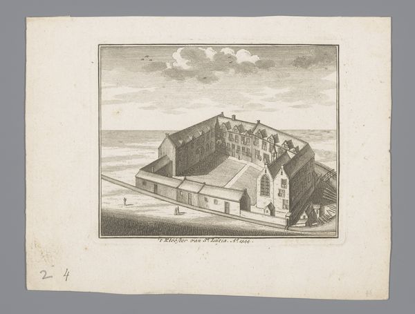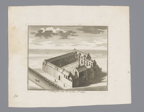 This black and white etching, titled "Vogelvluchtaanzicht op het Cellebroedersklooster," was made in 1544 by an anonymous artist. The architectural structure of the Cellebroedersklooster is laid out before us with meticulous detail. The image provides a bird's eye perspective, which allows us to see the geometric layout and organization of the monastery. The linear quality of the etching emphasizes the clean, orderly design of the building, presenting it as a model of structured living. Notice how the artist uses line and shadow to create depth, delineating the spatial relationships between the buildings and the open courtyard. The building itself, a place for religious community, thus takes on a semiotic function, reflecting the values and worldview of the community it houses. The perspective and composition of the artwork not only depict the building, but invite reflection on the nature of order, perspective and representation itself.