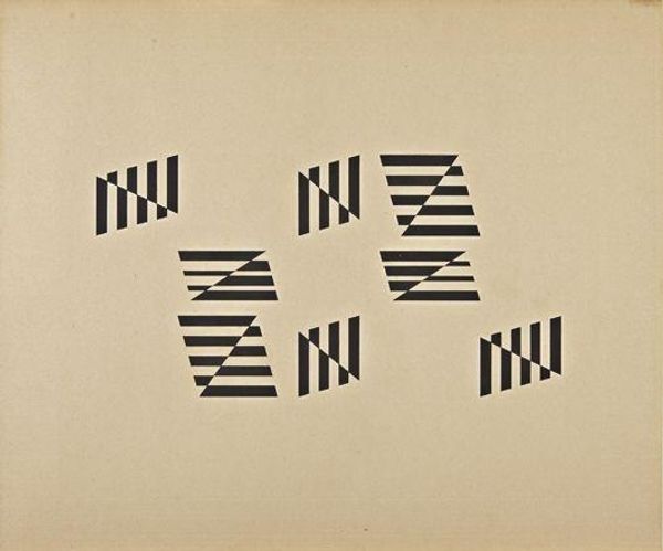 Editor: So, here we have Helio Oiticica's "Metaesquema" from 1957. It’s an Op Art piece with geometric figures in black on a tan background. I find the arrangement strangely unsettling, almost like these shapes are trying to communicate some coded message. What's your read on this work? Curator: Well, in the context of 1950s Brazil, geometric abstraction like this wasn't just about aesthetics. Oiticica was part of a broader movement reacting against the emotional intensity of Art Informel. They were looking for a new visual language, one that reflected Brazil’s aspirations for modernity and industrial progress. These "coded messages," as you call them, are attempts to create a universal language, detached from subjective emotion. Do you see any traces of that "detachment"? Editor: I guess I do see that detachment a bit now. They are so uniform and cold, and almost sterile, which must've seemed progressive at the time, since Brazil was rapidly developing. But doesn't it also run the risk of being, well, soulless? Curator: Precisely. And that's the fascinating tension! On the one hand, you have this desire to embrace modernity, to create art that's 'useful' and 'objective.' On the other hand, there's a real risk of dehumanization, of losing the human element altogether. So, it reflects social anxieties too. How does this artwork inform or relate to socio-political sentiments of the time? Editor: I didn't think about it like that. Seeing it in this cultural context shows how Oiticica reflected his reality within a minimalist and geometric form. Thanks, it makes more sense now. Curator: Exactly. Art always reflects socio-political values and anxieties in some shape or form, which are very vital to its understanding. A useful framework.