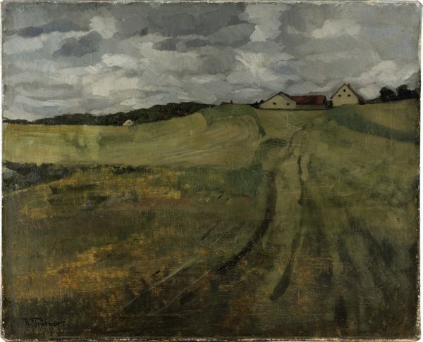 Editor: So, here we have "Road near Brendekilde Church" by Hans Andersen Brendekilde, an oil painting, and it just feels... very still. There’s almost a palpable sense of quiet in this rural scene. It’s beautiful but makes me want to add color and vibrancy. How do you see it? What stands out for you? Curator: That stillness, that's it, isn't it? Like holding your breath as you look. I see a moment caught in time, a slice of Danish countryside that speaks volumes about the lives lived there. The muted palette almost heightens the scene’s sense of nostalgia. There's this long, ochre road dominating the view, but do you notice how it draws you toward that hazy church and village buildings in the background? Editor: Yes! And the texture of the road itself - the wagon tracks... it implies human activity. What’s compelling about using realism in landscapes like these? Curator: Realism isn't just about copying what you see. Here, it’s about capturing the essence of a place, a feeling, almost a social commentary without needing to say a word. Brendekilde was interested in the everyday lives of peasants. This isn’t romanticized; it's raw, simple, honest. Think of it almost as visual poetry. What do you think the absence of people contributes to this effect? Editor: Hmmm… It gives it a sense of timelessness? Maybe the painting isn't about any specific person's story. I get a deep connection to a real place and feeling with no specific focal point. Curator: Exactly. It invites you to imagine your own story within that space. I agree wholeheartedly: a poignant snapshot that holds a whole world, quiet as it is. A place where history, spirit, and simple forms come together in complete unison.