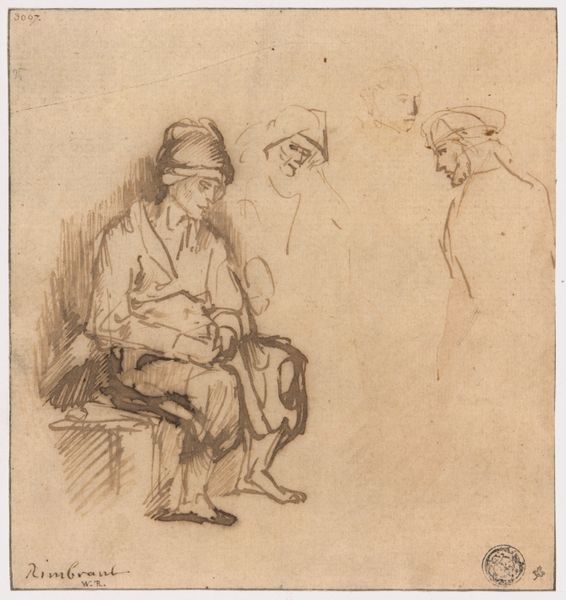 Editor: Here we have Pieter van Loon's "Karikaturale scène van een jonge man die bij een oudere man geld tracht los te peuteren," created in 1862. It's a pen and ink drawing. The figures appear quite animated; one is gesturing emphatically while the other looks rather stoic. What catches your eye about this piece? Curator: This drawing offers a fascinating glimpse into social dynamics of the mid-19th century. Van Loon's caricature captures not just individual personalities but a power imbalance. The "young man" importuning the older figure speaks to broader economic realities – perhaps anxieties surrounding inheritance, or the struggles of emerging middle classes navigating established wealth. Editor: That's interesting, I was only thinking of a general feeling but how does it reflect its time? Curator: Look at their clothing, their postures. While exaggerated, they're rooted in observations of contemporary dress and comportment. Think about the role of caricature in popular media at the time; it was a tool for social commentary, often used to critique the wealthy or powerful. Does that add another layer to the exchange between these two men? Editor: It does. I see now how the exaggerated style works to critique class dynamics instead of just being funny. Curator: Exactly! The public function of such imagery makes it interesting. Van Loon uses his artistry to depict a scenario freighted with socio-economic meaning. Editor: I hadn't considered how social commentary can be embedded within seemingly simple sketches like this. Thanks! Curator: And I am intrigued by how popular imagery could influence social relationships; food for thought!