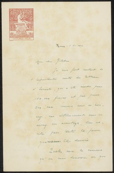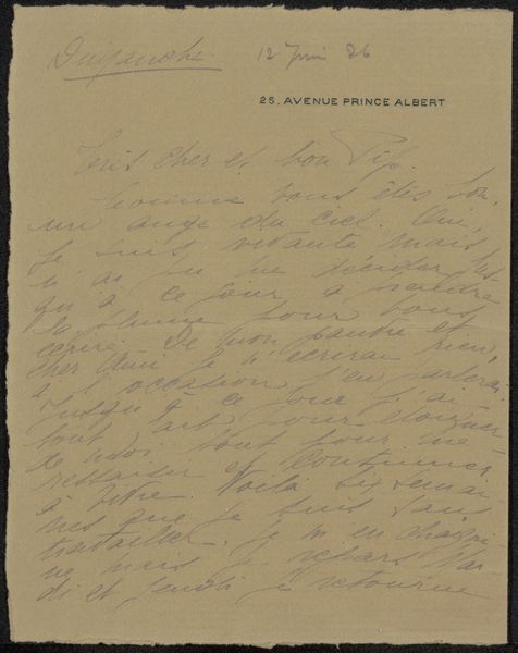 Curator: Here we have a prentbriefkaart, that's postcard in Dutch, addressed to Anne Marie Louise van der Linden, penned by Emile Bernard, sometime before 1908. It's ink on paper, a small and rather unassuming Post-Impressionist artifact. Editor: It's funny, isn't it? How something so seemingly mundane—an old postcard—can feel like holding a little piece of someone else's world in your hands. It feels strangely intimate. Curator: Precisely! Bernard, although somewhat overshadowed by his contemporaries like Gauguin and van Gogh, played a key role in the Post-Impressionist movement. This postcard provides us with insight into the artist's communication during that period, revealing the personal networks that sustained the artistic milieu. Editor: I am drawn to its raw, almost vulnerable, nature. Look at the handwriting itself—it gives a kind of texture that smooth font wouldn't. He mentions monasteries and valleys and asking if they are inspiring other artists. Curator: Bernard's correspondence reveals his creative thoughts and personal connections. His network provided emotional and practical support, which underpinned the advancement of modern art. He used it as a means of expression, blending art and life. The postcard functioned both as a personal note and an artifact imbued with artistic significance. Editor: You’re right. And there's the context of postcards themselves. In that era, it was such a novel, affordable way to connect. These miniature artworks traversing countries, bearing witness to everyday life, personal thoughts—it humanizes history so much more. Curator: Absolutely, and we are able to glimpse into it now. It reminds me of the importance of correspondence as an art form. They aren't always about monumental paintings but smaller acts that fostered artistic dialogues and collaborations, right? Editor: I think I get a different perspective on Bernard’s other works seeing his voice like this. Less about form, more about…yearning. A little melancholic but also curious. It helps peel back the layers to understanding him better. Curator: This small rectangle, almost lost in time, speaks volumes about artistic sociability. We realize how that world was created thanks to the daily life materials. A brief postcard.