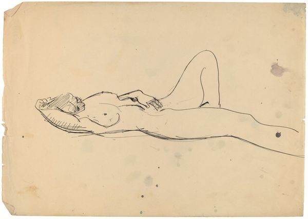 Editor: This is Mark Rothko's pencil drawing, "Sleeping Woman, Head Resting on Arms." The simple lines create a quiet and intimate mood. What stands out to you about it? Curator: The seemingly simple composition invites us to consider the politics of representation. A woman asleep, vulnerable. Who is permitted to witness this private moment and what power dynamics are at play? The gaze is unavoidable, but Rothko’s unfinished lines suggest a level of incompleteness. Do you think it diminishes or enhances the subject's power? Editor: I see what you mean about vulnerability. Maybe the loose lines emphasize her humanity and make her less of an object to be looked at. Curator: Exactly. This "unfinishedness," challenges traditional patriarchal artistic ownership of the female nude and prompts us to question what the image "possesses," if anything, about the sleeper herself, particularly through a modern lens. Where does the viewer's imagination intersect, and perhaps interfere, with the subject's autonomy? Editor: It's interesting to think about the work as incomplete instead of just a sketch. The meaning shifts. Curator: How do you imagine a woman views this, versus a man? Does our own identity impact what this drawing expresses? Editor: It makes me consider the gaze critically and the historical implications of representing women. Curator: Indeed. Viewing historical artwork through a contemporary lens illuminates ongoing power imbalances. And asking those hard questions helps to pave paths toward inclusivity in the art world. Editor: This has really opened my eyes to a different way of interpreting figure drawing. Curator: Mine too. There's so much to discover when art and intersectional viewpoints meet.