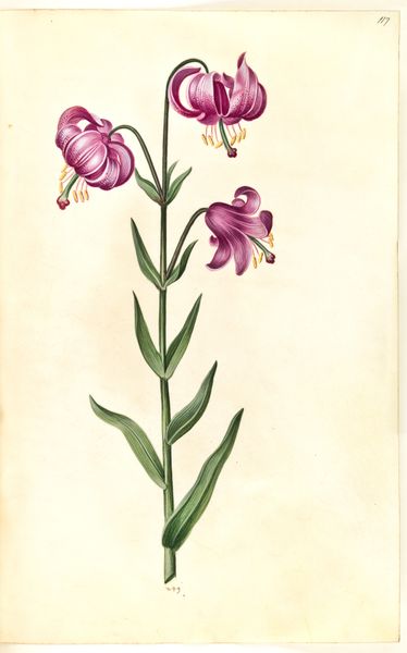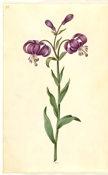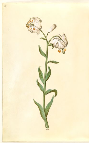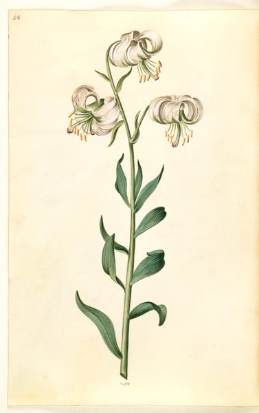 Hans Simon Holtzbecker made this botanical drawing of a Lilium martagon, or Turk's cap lily, most likely in the mid-17th century. Holtzbecker lived in a time when botanical illustration was shifting from mere documentation to an art form, reflecting an increasing interest in the natural world and its potential uses. What strikes me about this piece is how it captures the tension between objective scientific observation and an almost romantic rendering of nature. On one hand, Holtzbecker meticulously details the lily's form, with its gently curving leaves and speckled petals. But on the other, there’s a softness, an almost feminine quality to the way the flower is presented, which speaks to the historical gendering of nature as female. Botanical drawings like these were not just about science; they were also about power, reflecting the colonial impulse to classify and control the natural world. But within that context, Holtzbecker's lily stands out, a delicate yet resilient symbol of the complex relationship between humans and the environment.
