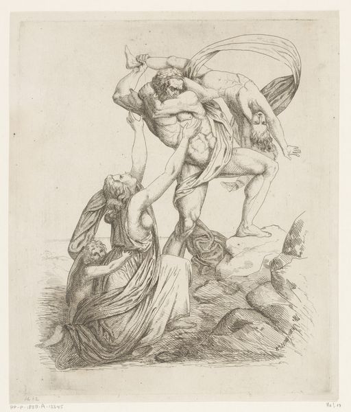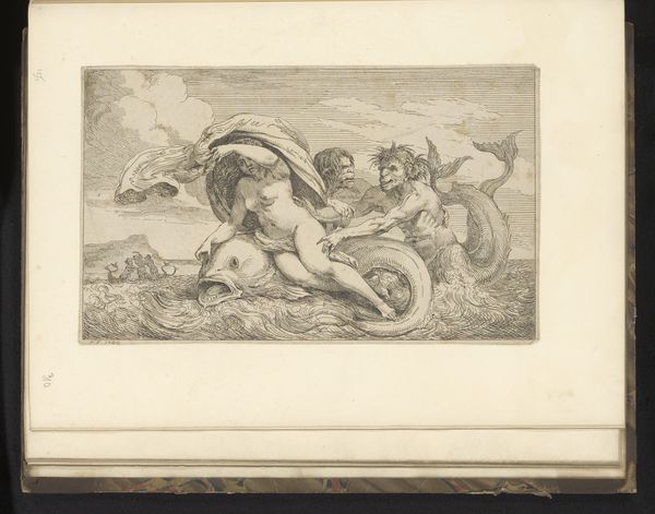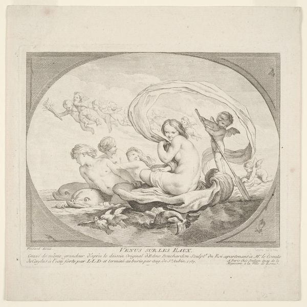 Editor: This etching, "Acis and Galathea" by Francesco Bartolozzi, from 1787, has a really dreamlike quality. The figures seem to float across the sea. What do you see in this piece, and how might we understand it through a contemporary lens? Curator: It's fascinating how Bartolozzi uses the mythological tale of Acis and Galatea. It presents us with a lens through which to consider power dynamics, gender, and even ecological concerns. Think about Galatea, a sea nymph, and her lover Acis, pursued by the monstrous Polyphemus. It raises the questions: Who has the right to possess, to desire, and to destroy? What kind of narrative does the exclusive depiction of beauty and privilege, devoid of its socio-economic and historical contexts, reinforce? Editor: So you are suggesting the classical narratives of love, beauty, and divinity that we often see may hide some potentially uncomfortable politics of privilege? Curator: Exactly. In the original myth, Acis is murdered out of jealousy, transformed into a river, suggesting themes of violence against men. The idyllic scene also belies a tension present within class structures and unequal access to the spaces presented, then and now. What stories do we tell and whose perspectives are privileged and silenced? Considering such issues can help to unpack historical dynamics of oppression. Editor: That's a perspective I hadn't considered before. Seeing this idyllic scene as a site of social commentary and questioning really challenges my initial interpretation. Curator: It is about engaging with the artwork as part of a wider discourse, connecting what it meant then, and what it could signify now, given current discourses. Recognizing it will never be an exhaustive understanding of all intersections. Editor: It has given me much food for thought on classical narratives and their complicated meanings. Thank you.
