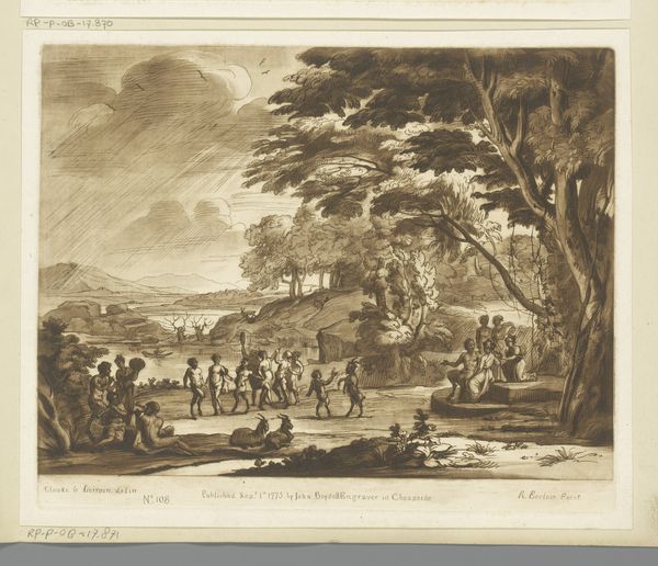 Curator: Ah, this is "Landschap met de dochters van Helios," or "Landscape with the Daughters of Helios," an engraving possibly from 1776 by Richard Earlom, housed here at the Rijksmuseum. Editor: It’s so...beige. Is that terribly rude to say? No, I’m serious—it’s like a sepia dream. There's something ethereal, almost ghostly about it. The light feels both distant and warm, you know? Curator: Not rude at all. Earlom was a master of capturing mood through tonality, wasn't he? He made the engravings after the original painting by Claude Lorrain. Helios' daughters are figures drawn from classical mythology. Their presence transforms what could be a simple landscape into an allegory. Editor: Exactly! It's more than just pretty scenery. The daughters—I can't help but see them as representations of light itself, kind of radiating outward, almost hesitant. They feel pulled between the world of mortals, represented by this shepherd nearby. Curator: Interesting interpretation. What I find compelling is how Earlom blends the classical with the contemporary. This is pure Neoclassicism; observe the carefully posed figures echoing ancient statuary but placed within this idealized pastoral setting that was super in vogue in the late 18th century. The symbolism layers historical understanding with this kind of dreamlike landscape. Editor: Agreed. It’s also that dance between shadow and light again. That cluster of trees to the left feels heavy, almost protective, sheltering the daughters of Helios, but opposite is like is open, exposed area near the shepherd. It really anchors the whole image, though. So much symbolism bound by technique... I can almost feel Earlom wrestling with his own ideas as he made the engravings. Curator: It truly invites us to contemplate the nature of light, knowledge, the weight of classical thought during a changing society. Editor: Yes, absolutely. After spending some time looking at this artwork, it becomes more clear this seemingly static landscape truly tells a dynamic, beautiful story about transition and the continuous dance between familiar tales and how we receive them.
