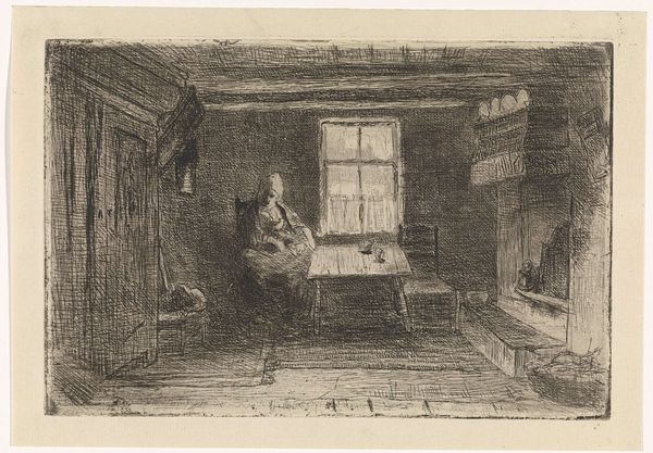 Curator: Looking at "Ung pige, som bøder et fiskenet", a 1904 etching by John Lübschitz, I’m immediately drawn to the weight of the scene. Editor: The lighting definitely sets a somber mood. It feels very constrained, doesn't it? You almost sense the weight of her labor just looking at it. Curator: Yes, the stark contrast between the dimly lit interior and the bright window really emphasizes the girl's solitary work. The print itself is fascinating – notice the deliberate mark-making of the etching, almost a woven quality that echoes the net she mends. The production here, in some way, mirrors that of mending nets. Editor: It speaks volumes about the economic realities facing women in coastal communities at the turn of the century. These genre scenes often highlight the labor involved and how the division of labor functioned along gender lines. And note how such images are circulated to tell the history of those communities and their dependence on labor. Curator: Absolutely, the netting, as an object of her labor, has a texture and physical presence – the meticulous craft of mending becomes very clear. The medium itself mirrors her action, doesn’t it? Consider also the potential of material exchange– this image produced for circulation outside her world. Editor: What is also interesting is how the placement of the window behind the young woman elevates this humble interior to a more spiritual realm. It is almost like a halo that surrounds her. Curator: I agree; the bright window seems to draw your gaze towards it in the picture. She is captured inside this constructed moment, doing repetitive manual labor– which perhaps gives the window behind her greater symbolic weight. She labors, captured, a subject of this scene. Editor: We see similar imagery becoming popular across Europe at the same time. Such art was meant to represent the 'real' everyday person. However, the question still lingers: Who defines such realities? Curator: It is definitely a crucial question. Examining these works closely reveals the choices embedded in representing such ‘realities’. Thanks for shedding light on its many different interpretations. Editor: Of course! Art always invites ongoing dialogue with the public. Hopefully, our brief chat can start just that.
