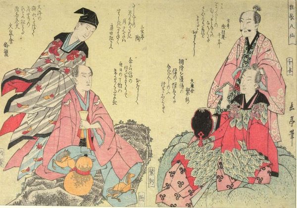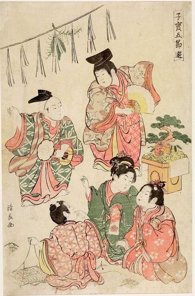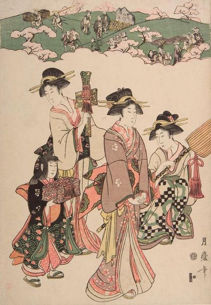 Editor: This is Kitagawa Tsukimaro's *BuyÅ Asukayama ShÅkei*. The woodblock print depicts women amidst a landscape. The patterns on their kimonos are so intricate. What can you tell me about this piece? Curator: The materiality of this print reveals much. Woodblock printing was a laborious, collaborative process. Consider the paper, the inks, the skilled carving – each element represents human labor and material resources, reflecting the economic and social structures of its time. Editor: So, it's not just about the image, but also about the making of it? Curator: Precisely. The consumption of such prints speaks to the social context and the aspirations of its audience. By examining the materials and production, we move beyond mere aesthetics. How might this change your perception of the artwork? Editor: I’ll definitely pay more attention to the production process going forward! Thank you.