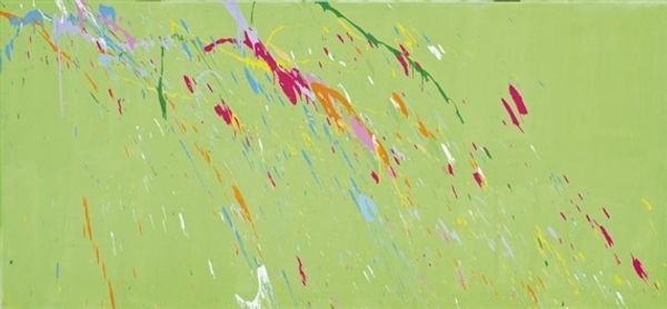 Curator: I find this Twombly absolutely haunting. Editor: You know, at first glance, it just feels… peaceful. This delicate green backdrop with these ethereal, cloud-like forms… it’s like looking at a tranquil garden after a rain shower. I find it surprising. Curator: Yes, peaceful on the surface perhaps. What we’re looking at is Cy Twombly’s "Untitled, (Peony Blossom Painting)," made in 2007. But let's consider Twombly's frequent use of floral imagery, almost as if these flowers were ghosts of former selves. Doesn't the monochrome palette and the dripping white paint lend it a certain melancholic weight, even violence? The bloom fading? Editor: Violence? I’m not so sure about that! But I agree about the monochrome. There's an immediate contradiction in terms – a peony should explode with color, be a symbol of decadence, but instead it is like faded glory, like an echo of its former beauty, as you pointed out. Considering the historical associations of flowers in art – particularly their representation of fleeting beauty, often associated with women, ephemeral femininity -- you can even say that these faded splashes refer to loss. Curator: Exactly. These “peonies” seem more like abstract concepts of flowers than faithful representations, don't you think? They're impressions of memory, emotions, maybe even an elegy of something long past, considering his life at the time. There is so much raw feeling. Editor: Absolutely. And thinking about abstraction in 2007, what does it signify after Abstract Expressionism? Perhaps that emotion and personal feeling continue to have a place in the 21st century, when digital culture reigns supreme. What kind of mark is left in our digital age? And, perhaps even more fundamentally, in an era of ubiquitous imagery, why make art at all? Curator: Precisely. This reminds us that images hold a power that transcends mere representation; they capture and project our internal landscapes onto the external world. I'm endlessly moved by how he achieved this depth with what seems like such simplicity. Editor: It's an incredibly powerful piece, leaving us with so many questions and quiet reflections on the ephemeral nature of beauty, memory, and artistic expression itself.