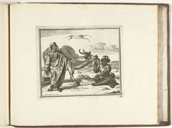 Editor: So this print, “Inwoners van Kaap de Goede Hoop, 1726,” by Carel Allard, gives us a glimpse into life in Cape Town during that era. It's an engraving. The figures are quite striking, but something feels...posed about them. What sense do you make of this artwork? Curator: It's crucial to remember the context of this print: 1726. This isn't a neutral depiction of local inhabitants. It’s European, likely intended for a European audience. Notice the ships in the background, and the stylized volcano – what story do you think the artist is trying to tell through this imagery? Editor: Possibly something about the Dutch presence there? I see how they are placed together, almost like a theatre scene, and maybe not how things really were. Curator: Precisely. These "genre paintings" often reinforced existing power structures. The artist is using stereotypes, perhaps unintentionally. The way they render skin tones, clothing or the lack thereof, and landscape, all communicate ideas about "otherness." Consider the politics of displaying images of colonized peoples. Does this artwork function to give real insight, or does it support European perceptions of difference? Editor: I hadn't really thought of it in terms of its potential use in legitimizing a political power or presence. Looking at it through that lens now is rather revealing, actually. Thanks! Curator: My pleasure. Remember, images aren't simply records. They actively participate in constructing historical narratives, and thus, play an active social role. And that's important.
