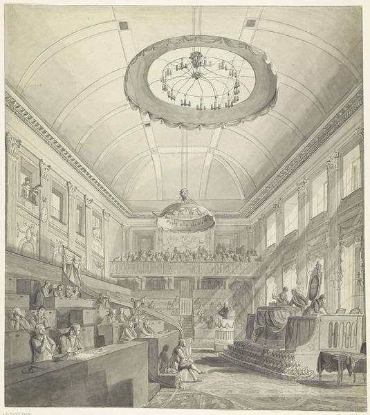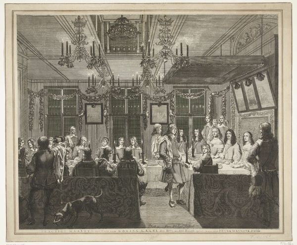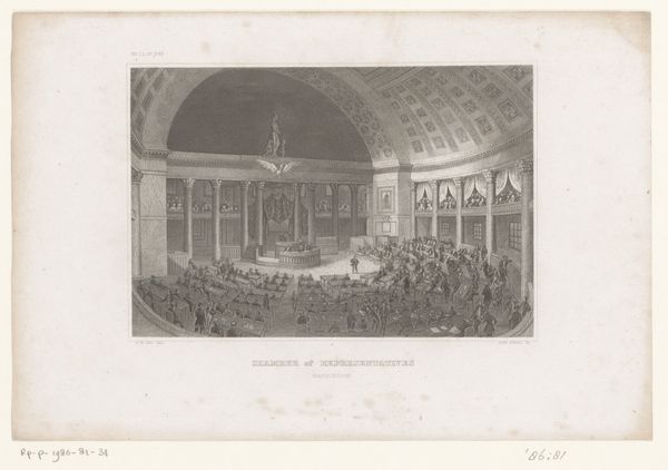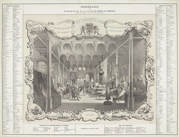 Editor: This engraving by Frederik Hendrik Weissenbruch, made sometime between 1859 and 1861, depicts the grand hall during an exhibition. It feels very documentary, like a snapshot of a cultural event. What can you tell me about the significance of depicting exhibitions in art? Curator: It’s interesting you call it a snapshot. Engravings like this served an important role in disseminating information and shaping public opinion about art and culture. Consider the context: increased literacy rates, the rise of the middle class, and a growing interest in art. How did these engravings democratize art? Editor: I guess by making art accessible to a wider audience through print, rather than exclusive access only by seeing it in person or if you are part of an elite circle? Curator: Precisely! Engravings such as this documented exhibitions, presenting them to those who couldn’t physically attend. Think about how these images would circulate – in newspapers, journals – becoming part of public discourse. Editor: So it's not just a picture, but an artifact that reflects the changing social landscape. It feels almost like an early form of social media. What do you find most interesting about this piece? Curator: I'm drawn to the interplay between art, the public, and the institutional spaces that showcased it. This engraving provides insight into the political dynamics of art display and the efforts to construct a national identity through art. Notice how people are presented and where the point of view places us in the scene. Who has access? What are they looking at? Editor: It's fascinating to consider this engraving as more than just a depiction of a room, but also about how art institutions presented themselves to the public and influenced society’s values. Thanks for highlighting the cultural context, it shifts the whole perspective. Curator: Indeed. Looking beyond the image itself towards its historical reception and the cultural forces at play gives it meaning.
