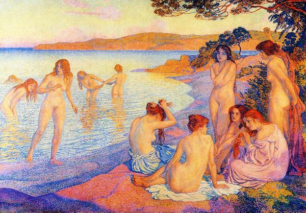 Curator: Let’s turn our attention to "Urteil Des Paris" ("Judgement of Paris") a painting attributed to Eduard Veith. What strikes you initially about this oil on canvas? Editor: A definite air of melancholy hangs over it. Even the lush landscape seems muted. Paris, especially, looks burdened by the choice before him. There's also an element of theatricality that suggests the painting wants to examine how judgements, beauty standards, and moral conflicts get mediated. Curator: Interesting. This work brings into focus the myth of the Judgement of Paris. Veith seems interested in how the visual tropes of Romanticism shape the narrative. Consider how classical myths are continuously revisited in the arts; it almost seems that Veith, painting towards the later part of Romanticism, uses the established landscape elements in order to talk about that tradition itself. The style situates itself and reflects on an imagined Arcadian past. How might symbols enhance our appreciation? Editor: Absolutely. A key symbol for me is that rather quizzical fox. A motif, for one, and a creature associated with cunning. Does it signify Paris’s inner turmoil, maybe the wisdom—or the deceit—needed to make his impossible choice? And the apple itself! A symbol of discord, yes, but also of knowledge and temptation. Here it becomes a tangible representation of moral consequence and self-determination. I notice how, of course, the Goddesses await that fateful selection with anxiety. This is such a clear, traditional image of looming and often unfair judgement of women’s appearances by powerful (and, in this image, distinctly bored-looking) men. Curator: Your reading brings another perspective to the interplay of social norms within mythological settings, highlighting themes of responsibility and self-awareness within the historical context of representation. Ultimately the piece engages its own past by considering that social critique as the story is literally told. Editor: I find myself reflecting on how the enduring power of mythological imagery provides a kind of mirror to our contemporary social preoccupations with judgements and standards, the costs of choosing and being chosen. Curator: Indeed. This invites us to view the artwork less as a mere historical artifact and more as an ever-relevant tableau of choice and consequence, a reminder perhaps of art’s constant negotiation with its traditions.