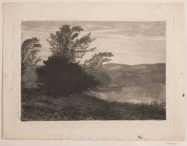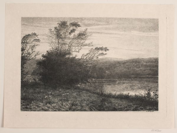 Curator: Vilhelm Kyhn created this print, entitled "Rye sø," in 1891. It is rendered as an etching. Editor: It’s melancholic, wouldn’t you say? A subdued tonality. Curator: Considering its historical context, Kyhn's commitment to Realism becomes quite significant. We see a distinct shift from the grand Romantic landscapes to something more immediate and relatable, don’t you think? Editor: Absolutely. This aesthetic reflected broader socio-political currents of the time. Landscape art in Kyhn's era wasn’t merely about depicting pretty scenes; it played a crucial role in shaping national identity. I’m curious about the choice of printmaking as a medium—an etching. Why not painting? Curator: Printmaking democratized artmaking and dissemination, and allowed works to be reproduced and widely distributed, giving Kyhn’s artwork greater circulation than a single canvas ever could. But tell me more about why you call this print “melancholic”? Editor: Note the subtle tonal variations in the etching—how the delicate rendering of light and shadow produces such a muted, thoughtful composition. You could also consider the subject. He didn’t select grand cliffs, but an isolated lake; the scale suggests humanity's relatively small impact upon the earth. Curator: And of course we must mention the craft of it, the marks etched and impressed, demanding certain sorts of physical labour but also inviting a type of reproduction. Its value resides both in the labor of the artist, as well as the democratic multiplication of prints to be distributed at affordable rates. Editor: Precisely, there’s a complex relationship here between the subject matter and the means of production, isn't there? Kyhn positions us in this place. How we approach the role of nature. Curator: Fascinating how this print allows us to contemplate not only the artistic decisions behind its creation but also the broader societal shifts of its time. Editor: A small work that nevertheless encompasses significant artistic and socio-political depth.