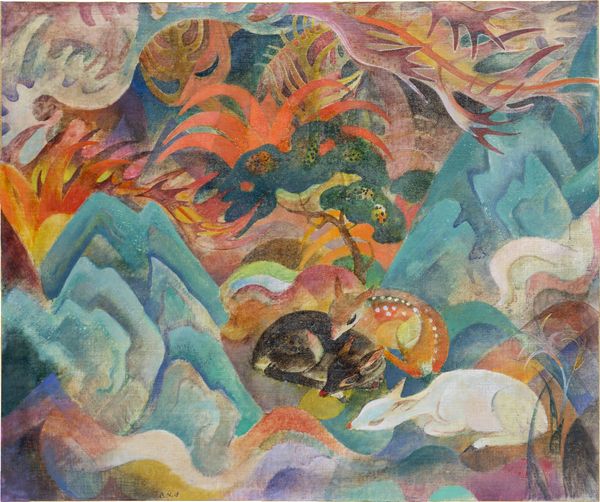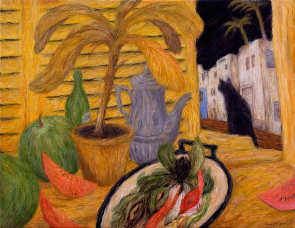 Curator: As we consider Zaniewski’s “Arabian Bazaar”, created with oil paint, I am struck by the intensity of its naive style, wouldn't you say? Editor: It does have that almost intentionally artless quality, yes, but my first thought is actually about the dreamlike quality. It's as if the bazaar is both there and not there, blurred around the edges. What symbolic undercurrents do you read into this work? Curator: I see layers of cultural encoding here, certainly. Notice how the figures almost seem like abstracted symbols, reflecting an anthropological lens on shared memories, where forms are simplified yet potent, redolent with ancient resonance and layered with meaning. Editor: True, the symbolism has weight, but isn’t there something politically fraught about this exoticised depiction of a market? Considering how Orientalist tropes shaped Western perceptions... Curator: That is an important and valid perspective! We should always acknowledge how art can perpetuate skewed visions and cultural biases. Yet, there’s also something archetypal in its simplicity that evokes human transactions as rituals in an exotic tableau. What can we tell, looking at Zaniewski’s application of paint, his brushwork? Editor: The brushwork, yes, quite vibrant despite the somewhat subdued palette. Short, almost frantic strokes lend dynamism, suggesting the teeming life of a marketplace. The color palette almost flattens the space but then creates a sense of depth in other areas. I find that tension particularly interesting. Curator: I resonate with your remark on spatial relations— it's a fascinating distortion that creates this hallucinatory essence of recollection. The composition reinforces my intuition on its cultural undertones: it's more than just documentation—it feels steeped in cultural memories. Editor: Perhaps the most impactful component of the work for me is the almost otherworldly illumination of these common moments in what Zaniewski presents as foreign and unknowable lands, while simultaneously evoking the inherent allure of these settings. Curator: Ultimately, "Arabian Bazaar" encourages contemplation on memory, depiction, and representation in an idealized time and place. Its distorted, emotionally charged aesthetic sparks a desire for more discourse and analysis about its impact and place in modern painting. Editor: It serves as a prompt for thoughtful discussion about the cultural narratives that are visualized on canvas and ingrained over time, reminding us of the layered responsibility every image possesses.