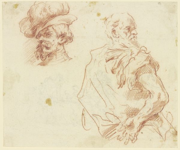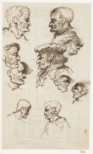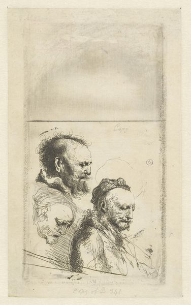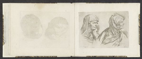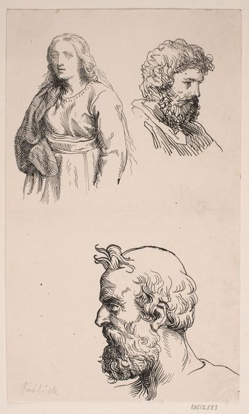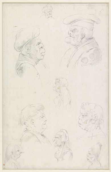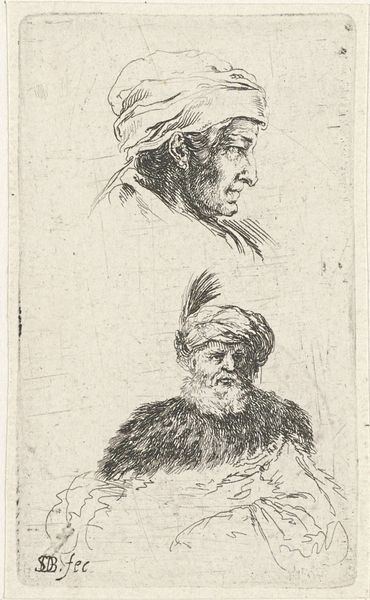 Curator: Stefano della Bella created this etching, “Plate 8: four small heads…” sometime between 1647 and 1652. It is from his 'Book for Learning to Draw’ and is currently held at the Metropolitan Museum of Art. Editor: What strikes me immediately is the contrasting profiles. A soldier and a Turk, a bearded elder and a young woman. They feel emblematic, almost like characters in a morality play. Curator: Indeed. Della Bella lived during a period of intense social and political change in Europe. The presence of the soldier, especially, alludes to the omnipresent atmosphere of war and its impact on society. Editor: The "Turk," as they labeled him, intrigues me. Turbans held deep cultural significance, immediately denoting identity, status, and often, religious affiliation. It's more than just a portrait; it's an encounter with an "other." Curator: Right, it reveals how Europeans perceived and categorized different cultures. Prints like this played a crucial role in disseminating knowledge and reinforcing stereotypes. Note the distinct stylistic rendering for each figure—the crosshatching delineating the soldier's helmet is distinct from the looser lines of the Turk's turban. Editor: I am drawn to the gazes. Each head is carefully positioned. The bearded elder at the bottom seems to look upwards towards the heavens. It’s a direction we typically associate with religious contemplation. Is that intentional, I wonder? Curator: Possibly. Della Bella's prints were widely used as models for artists. This image, and indeed the whole book, could have served as a kind of visual vocabulary, providing examples of different expressions and human “types” for painters and sculptors. The composition emphasizes the universality of human emotion regardless of societal roles. Editor: So, the "Book for Learning to Draw" becomes more than just a manual—it's a snapshot of cultural attitudes and the politics of representation. It reminds us that even instructional art is never truly neutral. Curator: Precisely. Viewing art through the lens of history offers us the chance to appreciate it not just for aesthetic value, but also as a potent historical document. Editor: And deciphering the visual language offers keys to understanding how different cultures are categorized and valued. There’s more than initially meets the eye here.