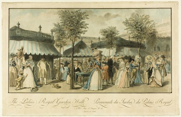 Curator: Thomas Rowlandson gives us quite the vibrant scene here with his 1785 Vauxhall Gardens. The piece employs watercolor and printmaking, a captivating combination to showcase this London pleasure garden. Editor: My first impression is one of controlled chaos! The composition teeters between structured elements like the architecture of the pavilion and a dense, almost overwhelming crowd of figures. The pastel palette, however, softens the impact and suggests a certain frivolity. Curator: Frivolity is definitely key to understanding Vauxhall’s appeal. It became a significant social space blurring class lines. Rowlandson highlights this mix through his portrayal of the audience. He doesn’t shy away from showing laborers mingling with members of high society. Notice the various costumes. What do they communicate about access and consumption at the time? Editor: The costumes! A veritable feast for the eyes, providing strong textural contrast and indicating social strata. The formal attire of the performers on stage sharply contrasts with the plainer garb of some figures in the crowd. It is visually a fascinating representation of hierarchy. What also catches my eye is the way the artist manipulates light and shadow; it isn’t about realism, but perhaps mood-setting through color value contrasts? Curator: Precisely. And think about the medium itself - printmaking enabled a mass audience to engage with these social scenes. This particular print could circulate and further shape perceptions of Vauxhall. It documents a shift from private patronage to a public culture accessible to a broader consumer base. Rowlandson tapped into this democratization through accessible artwork. Editor: This emphasis on distribution certainly gives the artwork a more profound significance than being a simple portrayal of Vauxhall Gardens. However, considering its visual properties, note how the composition leads your eye from the elevated stage, down into the foreground filled with the audience. In turn, the artist’s skillful handling of perspective adds depth and immerses us. Do you feel that his choices elevated the watercolor media towards high art status? Curator: Perhaps, but its enduring impact resides in illustrating shifts in society, capturing consumer culture and its material expressions during the late 18th century, a democratisation facilitated in part by advances in printing technologies that reduced production costs. Editor: I agree entirely! Rowlandson successfully combined social documentation with artistry and visual allure. The structure gives this piece power, in communicating 18th century public social spaces! Curator: Definitely, understanding both is fundamental in appreciating the art. Editor: Absolutely. A piece that invites continual observation, providing both societal insight and a formal mastery!