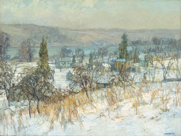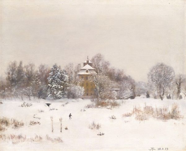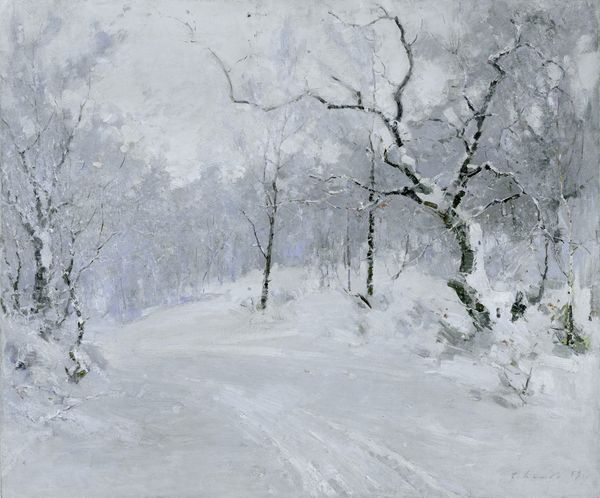 Editor: Here we have Claude Monet's "The Magpie", painted between 1868 and 1869. It’s an oil painting depicting a snow-covered landscape, almost monochrome. The cool blues and whites create a serene, but very stark, winter scene. How do you interpret this work, focusing on Monet’s method? Curator: Focusing on the process reveals the painting’s radical nature. Monet wasn't just depicting a winter scene, he was grappling with the materiality of snow itself. The impasto – the thick application of paint – becomes the snow. Look at the shadows: they’re not grey or black, but blues and violets, capturing reflected light. Consider also the plein-air method, confronting the actual conditions of painting outdoors in winter and struggling with freezing paint. This struggle is key to its form, isn’t it? Editor: That’s fascinating. It's easy to miss how groundbreaking this must have been, thinking about the logistics alone! Was this just about aesthetics, or something else? Curator: Well, consider the social context. Realism was in vogue, but Monet moved beyond merely representing reality to presenting his *experience* of it, and that means engaging with the raw materials of that experience and the materials of its production. Painting ‘en plein air’ demanded new transportable materials; this altered where and how painting took place, which has profound ramifications in what was painted. The labor, materiality, and context converge, don't they? It elevates his art beyond mere image making. Editor: That really shifts how I see it. It’s not just pretty, it’s a testament to the labor and material engagement in art creation at the time. Curator: Exactly. The magpie itself is a trace of materiality - evidence of animal presence, in contrast to all the cold. Editor: Thank you. I had not considered that it’s so much about confronting these material challenges in art creation itself. Curator: Indeed! It forces us to examine the physical engagement required, shifting art history from only iconographical meaning into art *making* and *production.*