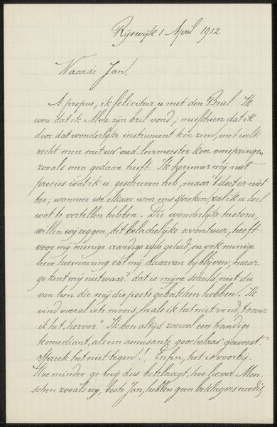 Curator: Welcome. Today, we're looking at a work by C.F. van der Horst: a piece entitled "Brief aan Philip Zilcken," likely created around 1896. It’s rendered in ink on paper. Editor: It’s so delicate! My first thought is how fragile this piece appears, both physically and in tone. The handwriting lends an immediate sense of intimacy and history. Like I'm peering into a private thought. Curator: Exactly. What's fascinating is the relationship between the materials - the very ordinary ink and paper - and the artistic intention. Consider the cultural significance of handwriting, the labour involved, before mass-produced text. It's not merely about transmitting information; it’s about craft. Editor: Absolutely, it elevates what could be just a mundane letter into an artwork. There is an undeniable artistic sensibility in the script itself, with its flourishing loops and the careful weight of each stroke. I find myself pondering the thoughts and feelings behind each word, almost as though I were reading his mind directly. Curator: I’d also point to the implicit power dynamics embedded in correspondence. This isn't a quick email; this letter represents a significant investment of time and resources. The paper itself, even aged as it is, suggests a level of societal access and perhaps some wealth on both sides of the exchange. Editor: True. Though, despite that context, for me, it evokes a sort of timeless quality. It makes you wonder what Philip Zilcken must have felt holding the letter. This glimpse into someone else's world, someone's private communication from a bygone era makes it a beautifully human object, don't you think? Curator: It is, undeniably, human. Editor: I think the materiality is inseparable from that human connection; feeling how the ink settled in certain places, seeing imperfections gives it character, in the same way a photograph is never going to convey every dimension of a scene, seeing a piece like this just is an incredible peek at the artist. Curator: I agree completely. And so it becomes a fascinating relic not just of art, but of social practice too, right? Editor: Precisely. This simple letter transcends its utilitarian purpose.