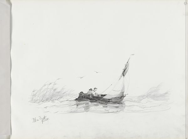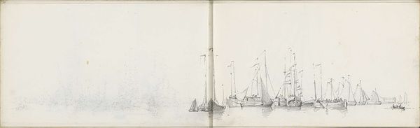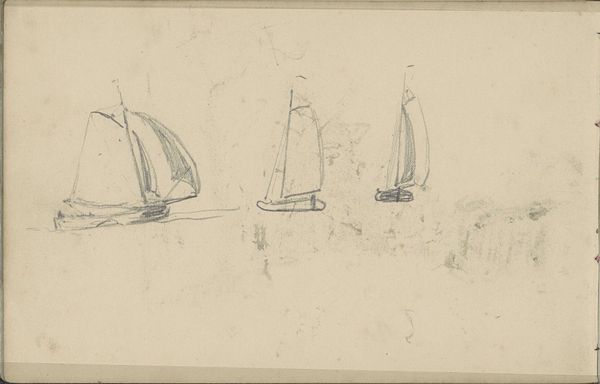 Editor: Okay, next up is "Zeilboot voor een kust," or "Sailboat off a Coast," a pencil drawing by Petrus Johannes Schotel, made somewhere between 1841 and 1865. It's so understated! Just two boats, a suggestion of land. It feels… almost lonely, in a way. What stands out to you in this piece? Curator: Lonely, yes, but also brimming with potential, isn't it? A blank canvas practically *begging* for a story. The realism mixed with romanticism creates this incredible tension. Like life itself – messy reality framed by hopeful dreams. Schotel wasn’t just documenting; he was hinting at voyages, at departures, at the vast unknown. Do you feel the pull of the horizon? Editor: I do, actually. It makes me wonder where those boats are going, or where they've been. And the sketch-like quality gives it such immediacy. Curator: Exactly! Think of this not as a finished piece, but as a fleeting thought, captured on paper. A visual haiku. He's giving us the *essence* of the seascape, distilling it down to its purest form. It's a memory, a dream, a whisper of the sea. Do you imagine you're on the beach, smelling salt in the air? Editor: I kind of do, yeah. It’s funny how just a few pencil strokes can be so evocative. I’d have thought a grand oil painting was required for Romanticism but the minimal approach works beautifully here. Curator: Beautifully put. And perhaps that’s the secret, isn't it? Sometimes, it's in the quiet, in the spaces *between* things, where true art – and true feeling – resides. The drawing whispers of adventure on the high seas, waiting only to be awoken. I almost want to find some color pencils myself. Editor: I totally get it. Thanks, that's given me a fresh perspective on sketching and what art can communicate without needing to be grand.