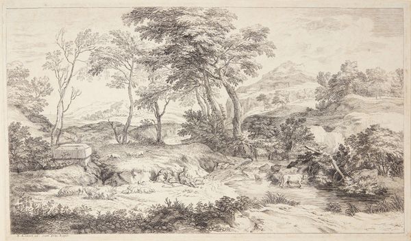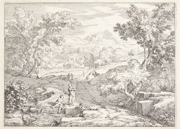 Curator: What strikes me first is the level of detail achieved through etching in Abraham Genoels' "Arcadian Landscape with a River" from 1675. It's a delicate dance between light and shadow, creating a scene that feels both inviting and slightly melancholic. Editor: The light, monochromatic landscape and idyllic imagery evoke an interesting narrative for sure. There's a tension inherent in representing Arcadia. While ostensibly a utopia, what colonial fantasies might the scene uphold through its evocation of classical pastoral ideals and what impact does this idealization of land have upon indigenous populations? Curator: A point well taken. The title itself signals the artist’s attempt to conjure Arcadia, an idealized vision of unspoiled wilderness, but as you suggest, devoid of true representation of real lived experiences, it remains a purely symbolic space. Notice how the etching technique allows Genoels to capture textures - the roughness of the rocks, the softness of the foliage. These aren't just generic trees; they are symbols of abundance, deeply rooted in cultural memory. Editor: Absolutely, but let’s remember how such idealized landscapes often serve as justification for territorial expansion. I can't help but read these scenes through the lens of displacement. The three seemingly casual, nearly nude, figures seem disconnected. What does it mean that the figures represented appear disconnected from the landscape even though they inhabit it, reinforcing dominant narratives of access and control of resources for certain bodies but not for others? Curator: Interesting. We might then consider the placement of the figures within the overall composition. The figures are quite literally marginal within the overall scene. But consider the rock they inhabit along the riverside as an anchor that grounds this scene. Water, itself, carries heavy symbolic weight representing transformation and purification, but also as the means to further colonization through routes of maritime access and enslavement. Editor: Yes, those nuances within broader, intersecting, historic contexts become incredibly important in the reading of such idyllic visual rhetoric, disrupting our contemporary consumption of bucolic fantasies and calling for further questioning of utopian visual constructs. Curator: Looking closely at the artwork pushes us to think critically about these layers. There's always so much more to landscapes. Editor: Indeed, it really allows for an engagement with the weight of symbols that we continue to reckon with.