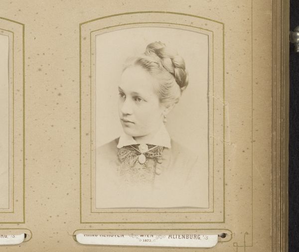 Editor: Here we have a photograph titled "Portret van Hilma Tengmark," dating from 1855 to 1890. It's located here at the Rijksmuseum. The image itself is striking, the texture gives it a certain depth for such a simple portrait. What do you see in it? Curator: Immediately, I think about the materiality of this object. Consider the process – the chemical interaction required to fix this image, likely a silver-based process, on paper or metal. What social and economic structures allowed for this image to exist? Editor: You mean like, the cost of photography versus painting, and who could afford which? Curator: Exactly. And also the labour involved. Think about the preparation of the photographic materials, the posing and staging of the subject, the printing process, all unseen labor that went into producing this portrait. And beyond that, the circulation of these images. Where would something like this be displayed, who was supposed to view this and under what conditions? Editor: It does seem very intentional, not a snapshot. What about the collar, the jewelry... wouldn't that material information speak volumes about the sitter? Curator: Precisely. Look at the brooch, the earring - likely mass-produced trinkets reflecting wider industrial processes. The image flattens distinctions while relying upon mass production for legibility, offering up social mobility and taste. Even the albumen paper signifies something beyond simple documentation. What might these choices suggest? Editor: This makes me rethink how something so seemingly straightforward tells such a complicated story. Curator: Indeed. Considering this image through its materials and production opens it up to larger historical and social narratives, allowing us to move beyond simply aesthetic appreciation. Editor: This was extremely enlightening, I will be sure to ask further questions about the process in similar situations.