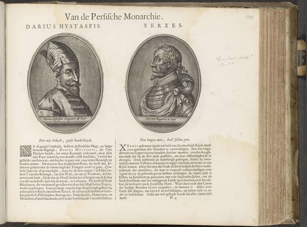 Editor: Here we have an engraving from possibly 1610 to 1654, currently held at the Rijksmuseum. The title translates to "Portraits of Cleobulus and Periander." The stark contrast and line work give it such a serious tone, wouldn't you agree? How do you interpret this work? Curator: Looking at the materials and methods, consider how this print was created. The act of engraving involves skilled labor, transforming a metal plate through deliberate actions into a vehicle for reproducing these portraits. Think of the social context: these weren't original artworks meant for display. These images were likely mass-produced and consumed as part of a book, "Van de seven Wyisen der Griecken", democratizing access to knowledge about historical figures, right? Editor: So, you're saying the print isn’t valuable as fine art, but as a means of circulating information and potentially shaping perceptions of these historical figures? Curator: Precisely. The engraving’s value lies in its role within the production and consumption of knowledge. Each line etched by the artisan becomes a vehicle to spread potentially new values or perpetuate a vision. Do you notice the stylistic elements adopted for each historical figure and how they relate to perceived wisdom? Editor: Yes, Cleobulus is depicted with traditional scholarly presentation. Whereas Periander wears his official ornaments of command... Curator: Indeed. So, the value we can give this artwork today lies less on the final representation of those leaders, but on the labor of representing and broadcasting the idea of leadership, what do you think? Editor: That shifts my perspective completely. I was so focused on the figures themselves, I hadn't really considered the social implications of how these images were reproduced and distributed! Thank you.