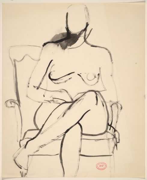 Curator: Looking at Richard Diebenkorn’s "Untitled [female nude lying back with legs out straight]," created sometime between 1955 and 1967, the initial impact is surprisingly raw. Editor: Raw is a good word for it! I see this languid pose, yet the stark black ink against the white feels so unresolved. Like a secret whispered in a crowded room. Curator: The confident lines immediately convey a sense of intimacy. We must acknowledge how Diebenkorn navigates the historical portrayal of the female nude. While he engages with the trope, he also introduces a vulnerability through the visible linework, challenging traditional notions of idealised beauty. Editor: Absolutely! It feels like we're witnessing the act of creation itself, this woman rendered with honesty, not artifice. Her hand casually resting, almost shielding, but not really. I wonder about her gaze… so much left to the imagination. The space surrounding her is so open that she's both the subject and a fleeting thought. Curator: It invites the viewers to question how femininity is represented. He avoids a sanitized or overtly sexualised depiction, instead offering a glimpse into perhaps a private, introspective moment. Consider, too, how his engagement with abstraction complicates the legibility of the figure, blurring boundaries, so to speak. Editor: Right! She’s present but somehow intangible. More sensation than concrete object. Did he leave so much undefined so we could feel into the image? He gives us an impression, a mood. I find myself connecting with her not as a "nude," but as a presence. Curator: And within the social context, it also feels important to understand the development of feminist art. Diebenkorn’s engagement with abstraction in the female figure challenges earlier, objectified portrayals. What we see is very much a representation with purpose. Editor: True. The purposeful and slightly broken composition… a story told without resolution. Leaving us, the viewer, lingering with possibilities. And that to me, makes it more than just a nude study. Curator: Precisely. I appreciate how Diebenkorn pushes the boundaries, prompting reflection on themes of representation, intimacy and female subjectivity. Editor: Me too. I keep coming back to how unfinished it seems, yet how whole the feeling is. It really stays with you.