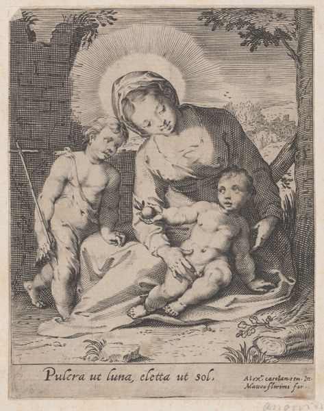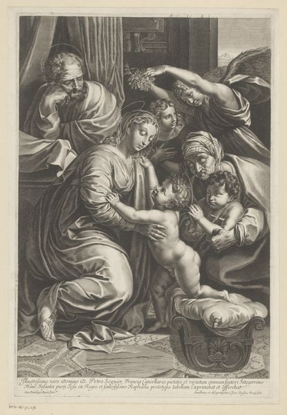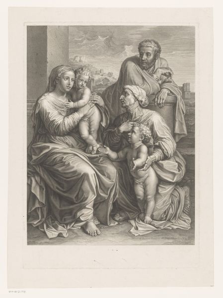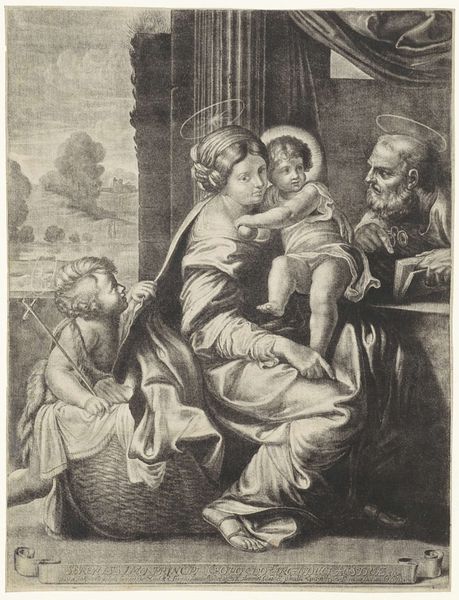 This is Giacomo Antonio Stefanoni's "Holy Family with John the Baptist," an engraving. The image is made through the labor-intensive process of cutting lines into a metal plate, inking it, and pressing it onto paper, a process that allows for the reproduction of images on a relatively mass scale. Engraving was a key technology in early modern Europe, facilitating not only art but also scientific diagrams, maps, and printed words – a whole world of visual communication. The crisp lines of the engraving give the image a graphic quality, sharply delineating form and shadow. Look closely, and you can see how the density and direction of these lines create volume and texture. The subject matter, a traditional religious scene, is given new life through this reproductive medium. The quality of line is the main event. Consider the time and skill involved in creating such a detailed image through purely mechanical means. It speaks to a culture deeply invested in both artistic expression and technological advancement. It’s an open question whether one advances the other, or vice-versa.