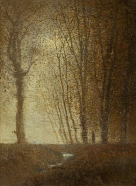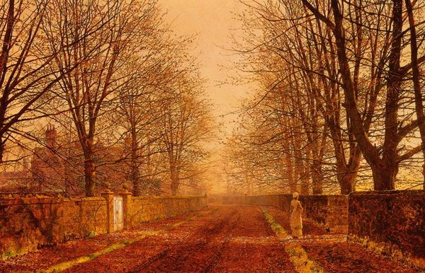 John Atkinson Grimshaw created this evocative nocturne titled, "October After Glow", in the late 19th century. Born in Leeds, England, Grimshaw is celebrated for his atmospheric paintings which often depict moonlit urban landscapes. His artistic journey began self-taught, moving against the expectations of his family. During the Victorian era, industrialization dramatically transformed urban life. Grimshaw captures this moment, portraying the beauty and mystery amidst societal change. His work often romanticizes the effects of modernity on the natural world. Here, the golden light casts a soft glow over the wet streets. The artist creates a palpable sense of quiet solitude. Notice the figure by the gate, perhaps returning home or waiting. What might they be thinking? Grimshaw's paintings invite us to contemplate the intersection of nature, industry, and personal experience, reflecting on the emotional and social conditions of his time.