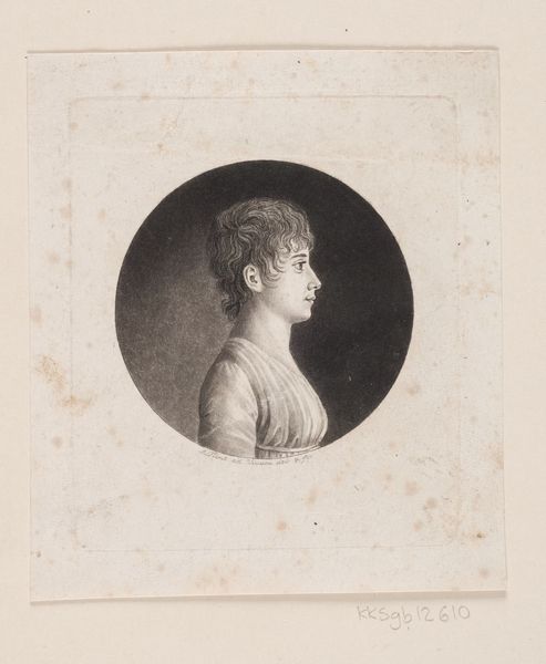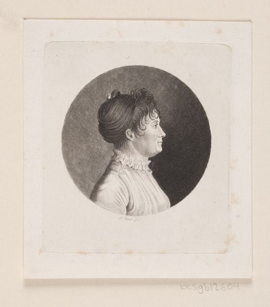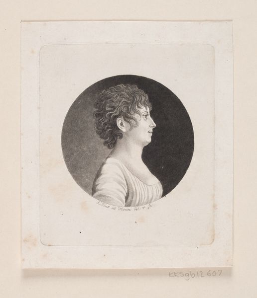 Editor: Here we have Andreas Flint’s print, "Elisabeth D. Olsen," which the museum dates sometime between 1767 and 1824. It has a rather stark, neoclassical feel with its use of line and the portrait’s profile, doesn't it? What stands out to you in this work? Curator: The profile, contained within a circle, echoes ancient coins and cameos, a deliberate recall of classical virtue and enduring legacy. Notice how her hairstyle, while fashionable, also hints at classical styles. These visual quotations tell us that Elisabeth and the artist saw themselves participating in a long and noble history. What do you think someone viewing this then would have thought of her necklace? Editor: It looks like a relatively simple string of beads, but given your focus on symbolism, perhaps the beads are stand-ins for pearls or other precious gems, subtly alluding to wealth and status without being ostentatious? Curator: Precisely. Each element, carefully chosen, contributes to a cohesive image projecting specific virtues and social standing. How might her rather direct gaze play into this? Editor: She seems to be looking out with a sense of confidence or certainty. The artist might be conveying her inner strength. Would I be right in saying this might also show aspirations in this period? Curator: Absolutely. And her strength as a lasting matriarch as we gaze upon her now. A potent image reflecting societal values and personal identity, wouldn’t you agree? Editor: I agree, I'll certainly never see these portraits the same way again.