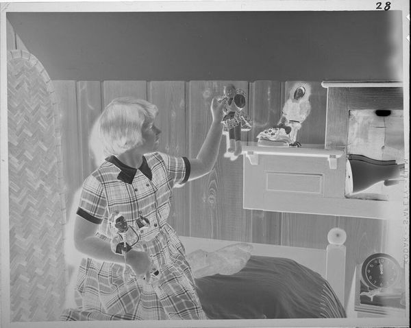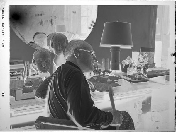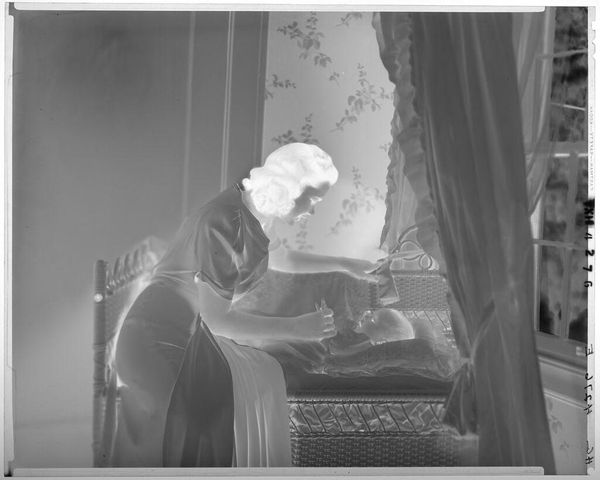 Curator: This photograph by Lucian and Mary Brown, currently held at the Harvard Art Museums, shows a bride seated on a couch, surrounded by women. It's an intimate scene, though its title remains simply "Untitled (bride on couch with other women standing)." Editor: There’s a strange, dreamy quality to it, almost like a memory. The inverted tones give it this otherworldly feel, as if we're peering into a forgotten moment. Curator: The visual effect is certainly striking. Consider the historical context – photography was becoming more accessible, capturing private moments with increasing frequency. This image hints at the evolving role of women within social rituals. Editor: Absolutely. But beyond that, I am wondering what she is thinking. Is she getting cold feet? Or is she just tired of all the fuss? You can almost feel the weight of expectation in the room. Curator: The image begs questions about societal expectations. It’s also a quiet reminder of the public role art plays in preserving collective memories and prompting dialogue. Editor: I am left wondering about all the stories hidden behind that veil. It's haunting and lovely all at once.