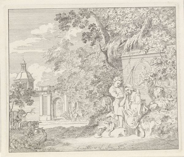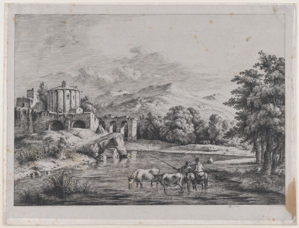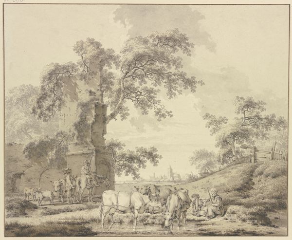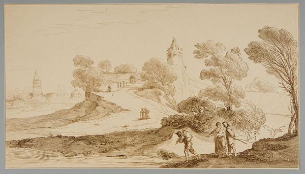 Curator: Immediately, I'm struck by the tranquil, almost ethereal quality of this landscape. It feels like a scene remembered from a dream. Editor: Indeed. What we have here is "Classical Landscape" by Thomas Sunderland, dating from the late 18th to early 19th century. Sunderland, born in 1744, employs a delicate wash technique. Notice how the grey ink unifies the composition. Curator: The balance between the architectural elements on the left and the wilder, more naturalistic landscape on the right creates a compelling visual tension. The eye is drawn through planes. Editor: I agree; the architecture symbolizes order, while the landscape evokes the sublime. Sunderland's position within the burgeoning picturesque movement of the time makes this a critical piece. Curator: Yet, beyond its historical context, there is an undeniable beauty in the linearity and tone. Editor: Yes, its serene power lingers.