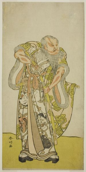 Curator: This is Katsukawa Shunko's portrait of the actor Sakata Hangoro II, held here at the Harvard Art Museums. Editor: My first impression is how much the patterned kimono dominates the composition, almost swallowing the figure. Curator: It's a woodblock print, likely mass-produced for popular consumption. The actor's image becomes a commodity. Editor: Look at the linear quality of the beard contrasted with the flat planes of color. The semiotic weight there is really interesting. Curator: The materiality of the print itself, the paper, the ink, speaks to the era's burgeoning print culture and its effects on fame and representation. Editor: The choice of such vibrant colors really emphasizes the performative nature of the actor, a visual spectacle. Curator: And the labor involved in the carving, printing, and distribution—a whole network supporting this single image. I find that compelling. Editor: Seeing how the artist uses flat planes to convey the actor's facial expression really emphasizes the abstraction that's happening here. Curator: Indeed, it reveals the intersection of artistic skill and mass production shaping celebrity. Editor: It offers a lot to think about; I'm still considering what to make of it.
