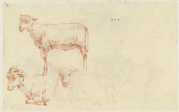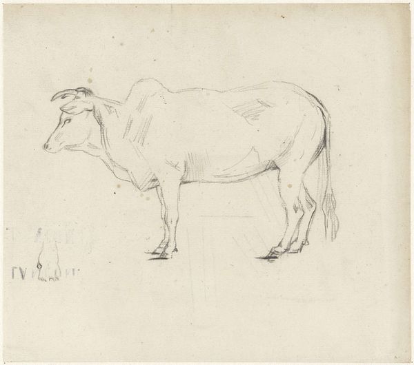 Curator: Welcome. We are standing before "Landscape with Cow and Horse," a drawing created around 1777 by Joannis Jacobus Bijlaert, part of the collection at the Rijksmuseum. It is crafted with pencil and graphite. Editor: There’s something remarkably stark about this sketch. The way the animals are rendered against that pale background gives it such an austere feel. The sparseness emphasizes their forms, their presence. Curator: Indeed. The lack of detail in the landscape shifts the focus entirely onto the animals themselves. Bijlaert has rendered them with realistic anatomy. Think of these animals as representatives of Dutch rural life and of simpler times. Editor: I'm struck by the cross-hatching; it gives so much texture, particularly to the cow. And the light seems to fall rather realistically. But where are we? I sense almost nothing of place. It makes them… universals, almost. Curator: Perhaps Bijlaert wasn’t aiming for specificity. In art, we often see animals symbolizing different virtues or concepts. A cow, for example, could signify abundance, while a horse might represent strength. Do you see this symbolism? Editor: Hmm. More persuasive to me is seeing these shapes as an essay in lines; notice how his strokes capture light playing across muscle. It seems more like observation. If we force meaning, we might overlook just seeing! Curator: A fair point. While the symbolism isn’t explicit, knowing the social context allows for these interpretations. Ultimately, these images reflected something important to viewers. They were, if nothing else, images of sustenance and stability. Editor: I can grant the importance to a period trying to see itself clearly. I'll walk away simply appreciating its careful artistry. There's a pleasure simply in its realism, however achieved. Curator: Yes, and thinking about the values Bijlaert's work has acquired over time provides the means to connect past to present, perhaps re-imagining how people viewed their daily surroundings two centuries ago.